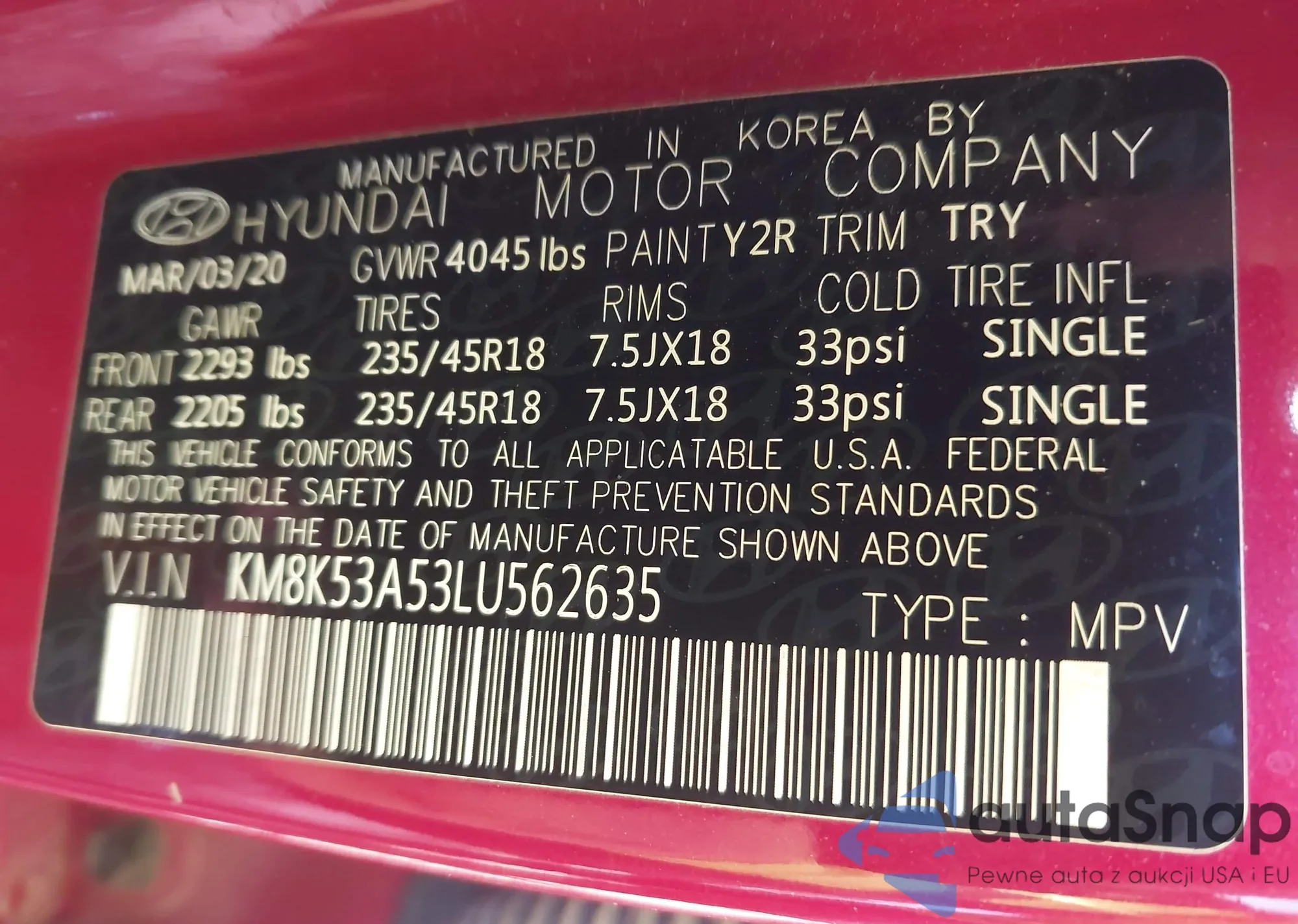 LOT: 43308477 VIN: KM8K53A53LU562635