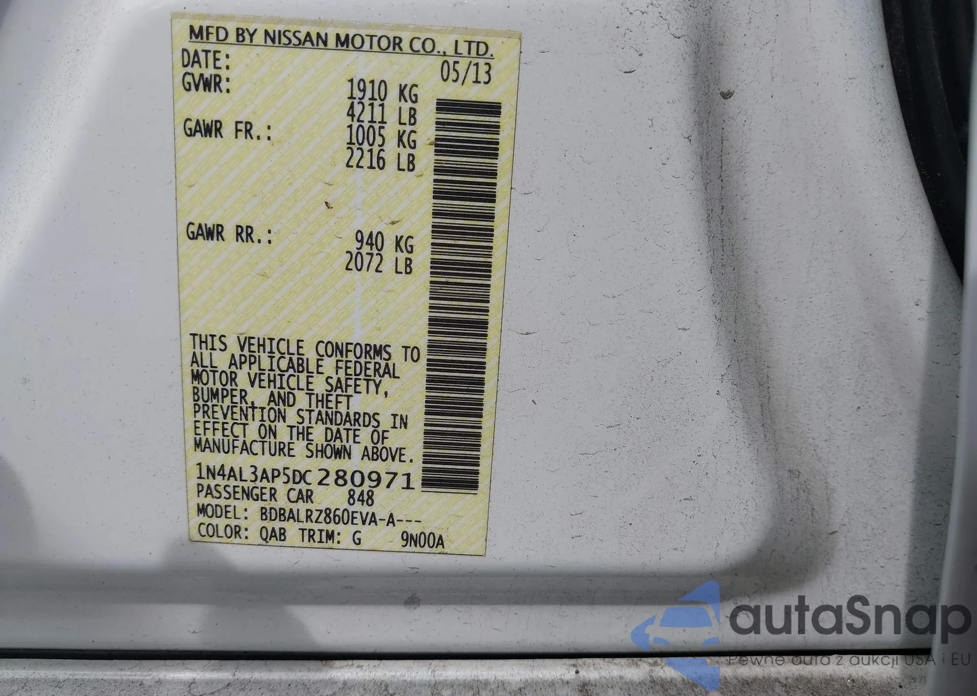 • VIN 1N4AL3AP5DC280971