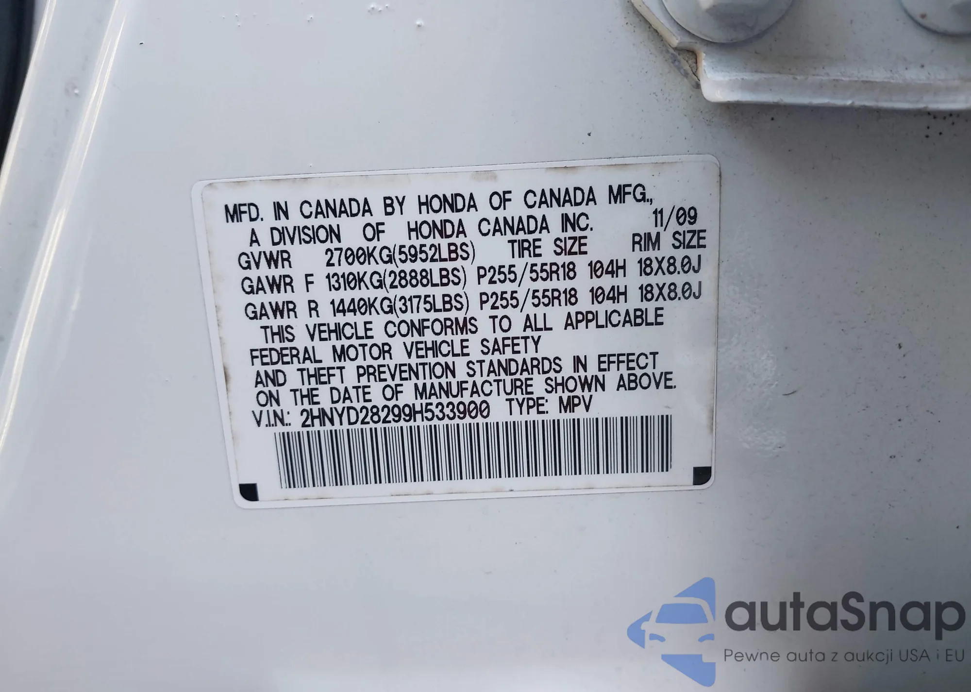 LOT: 43349535 VIN: 2HNYD28299H533900