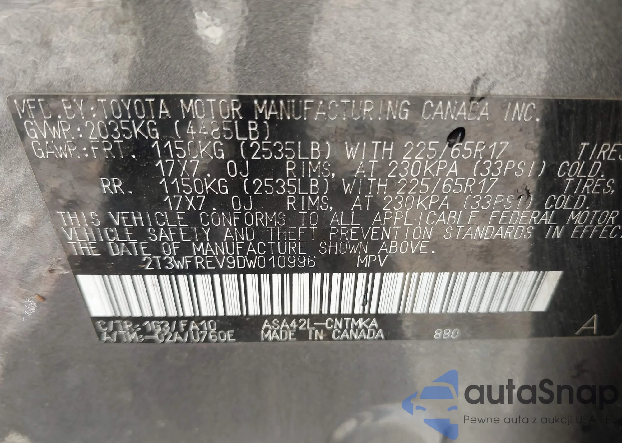 LOT: 43353182 VIN: 2T3WFREV9DW010996