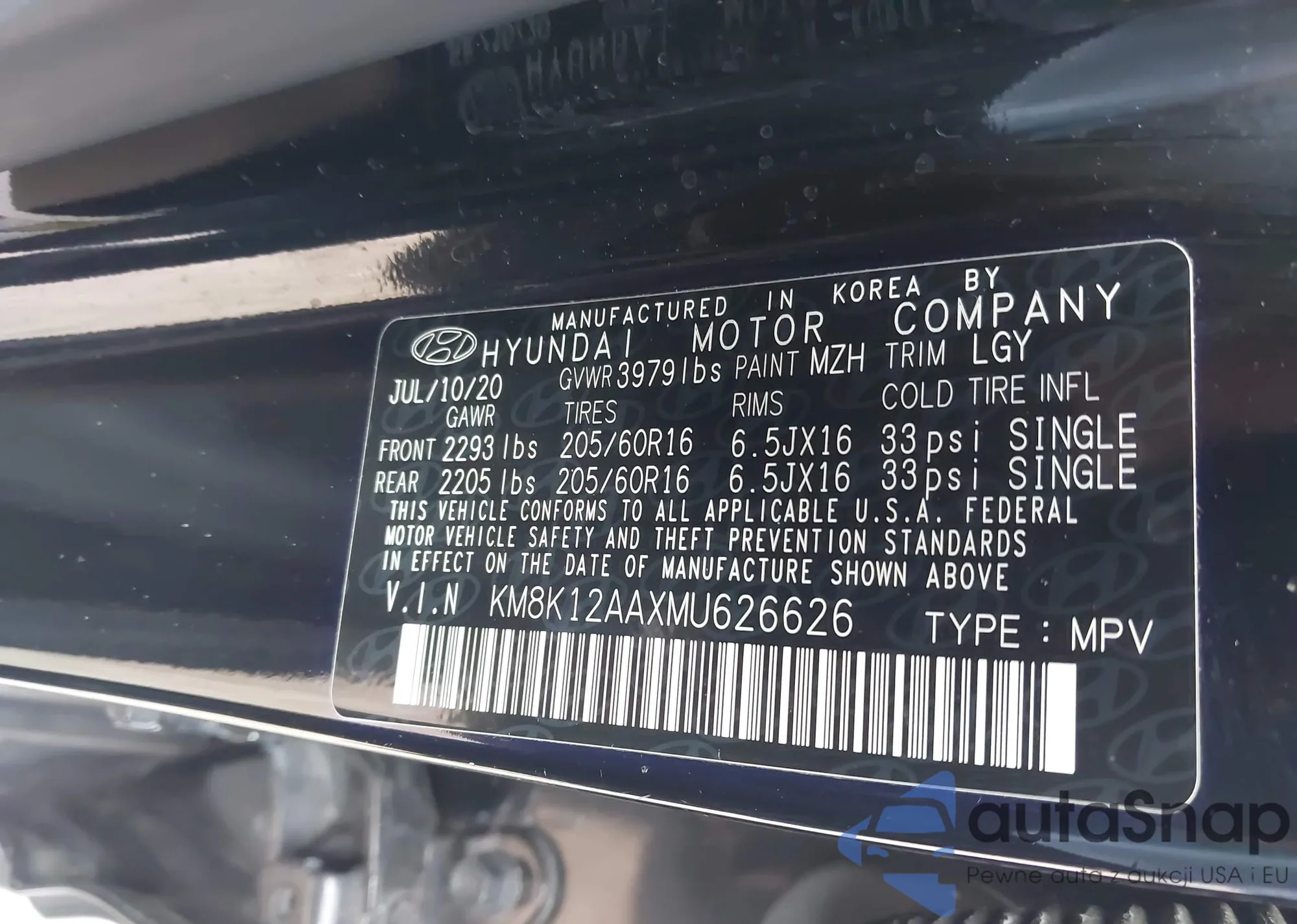 LOT: 43365822 VIN: KM8K12AAXMU626626