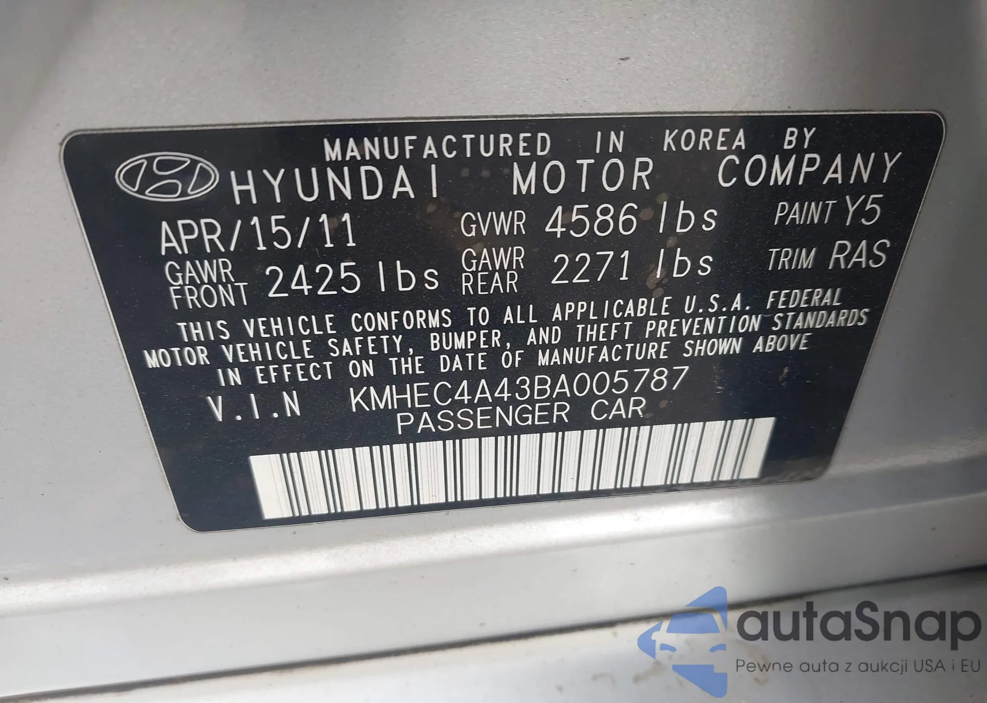 LOT: 43334157 VIN: KMHEC4A43BA005787