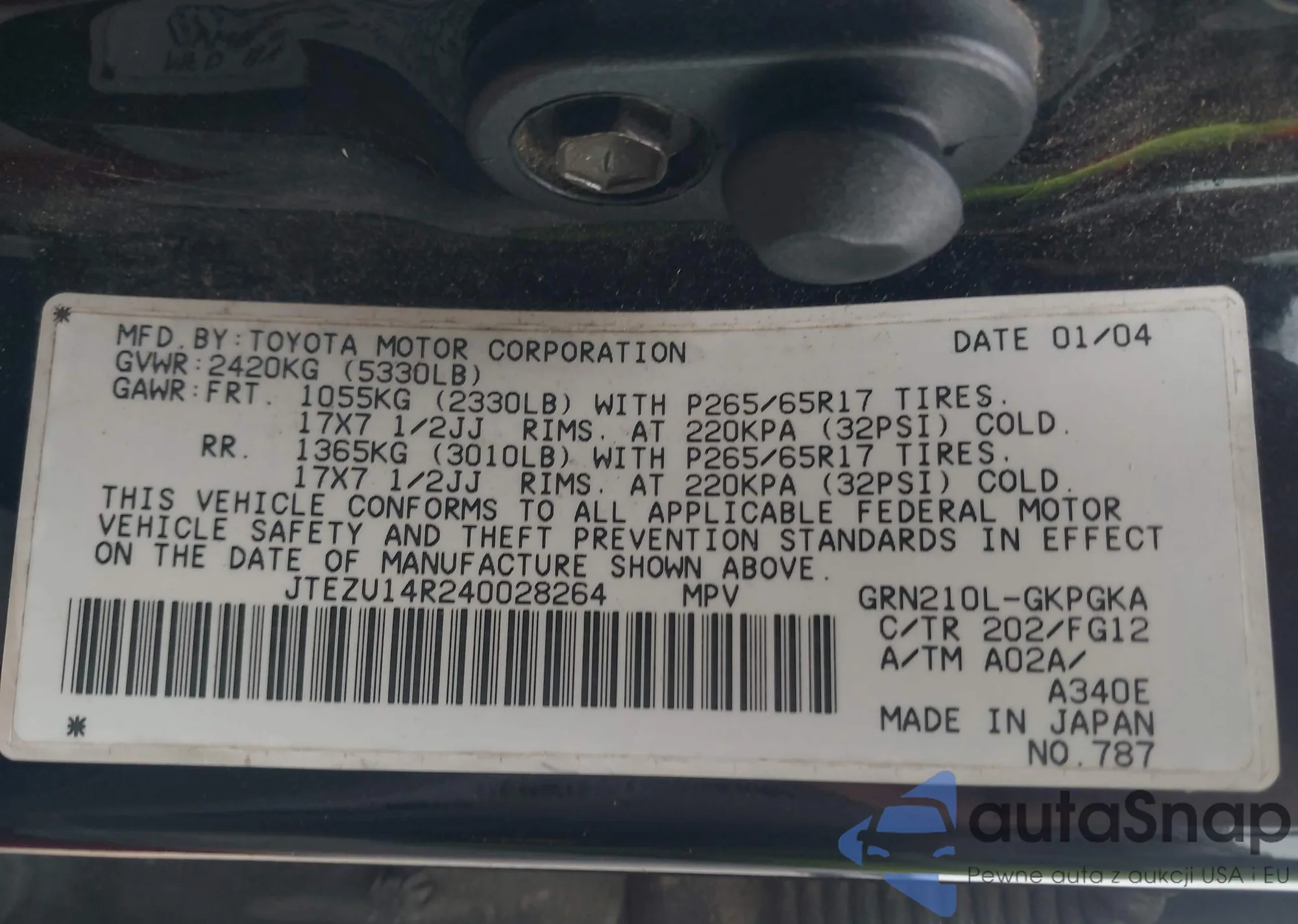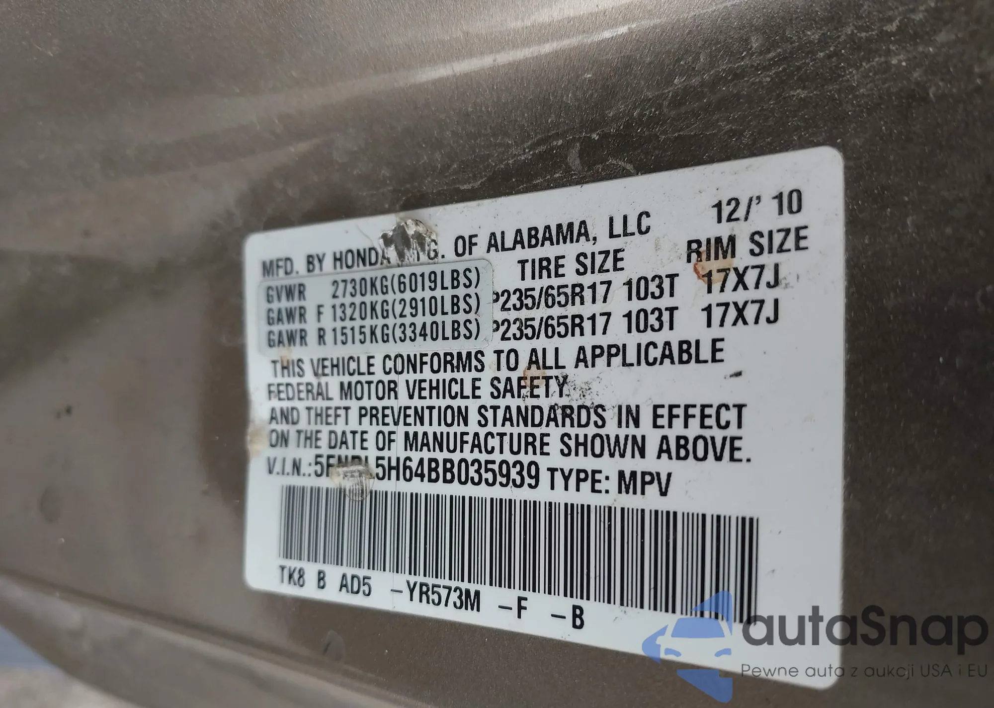 LOT: 43361089 VIN: JHMFB4F39CS003726