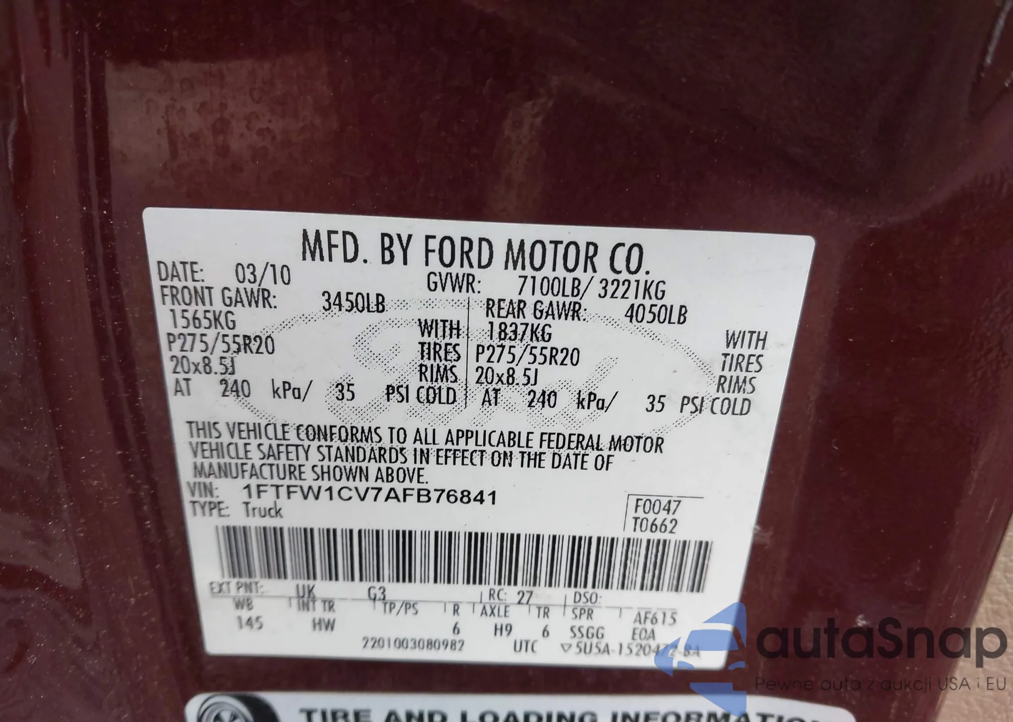 LOT: 43418963 VIN: 1FTFW1CV7AFB76841