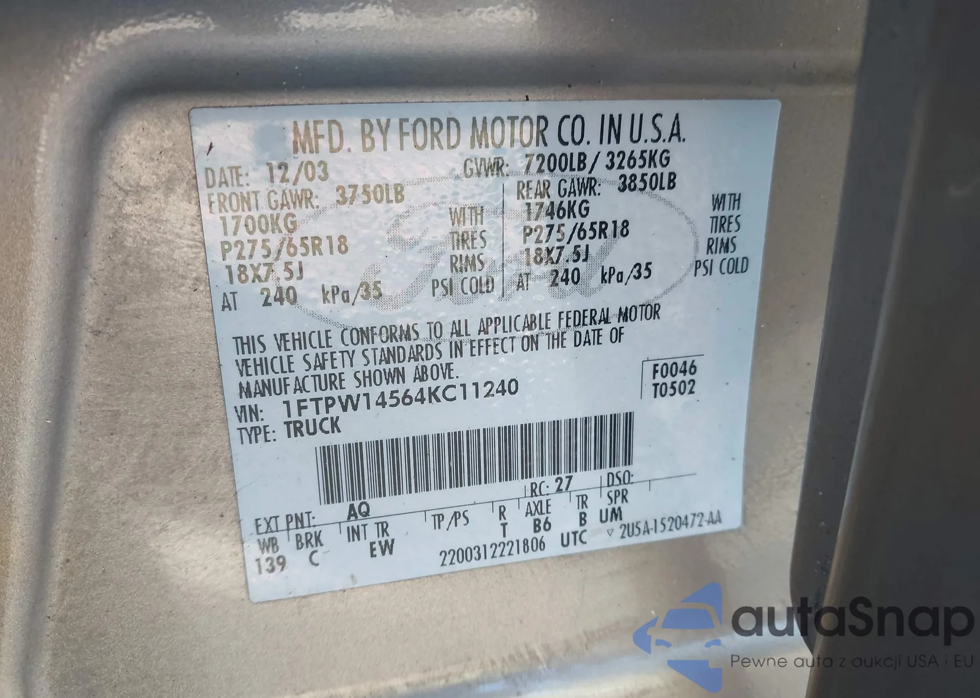 LOT: 43378340 VIN: 1FTPW14564KC11240