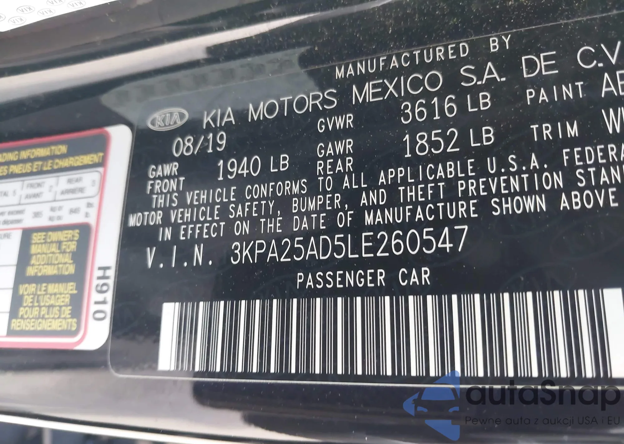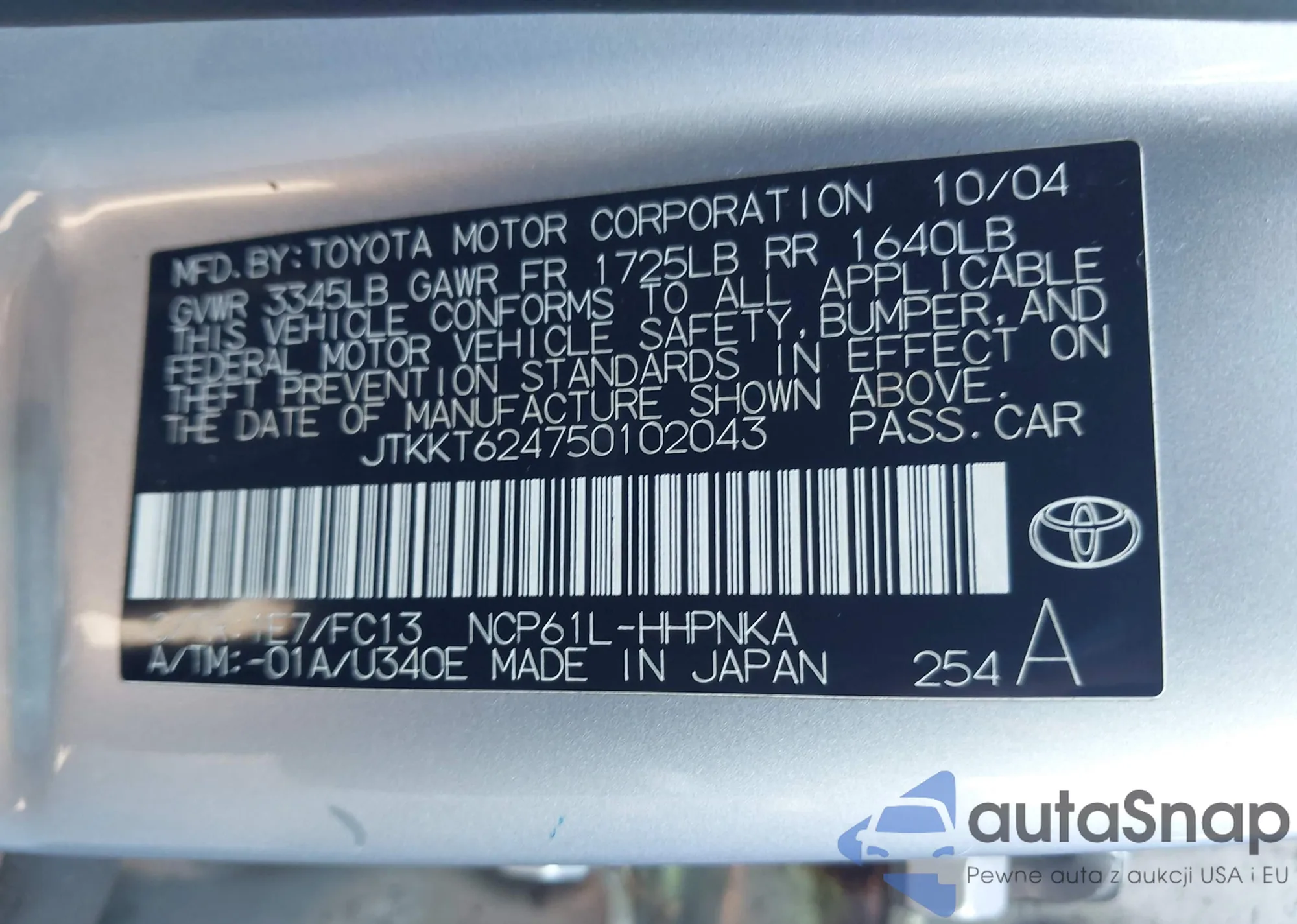 LOT: 43447462 VIN: JTKKT624750102043
