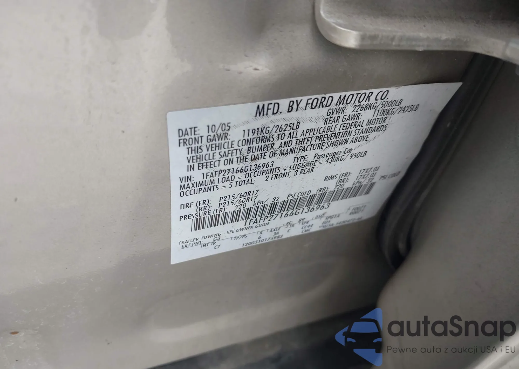 LOT: 43448743 VIN: 1FAFP27166G136963