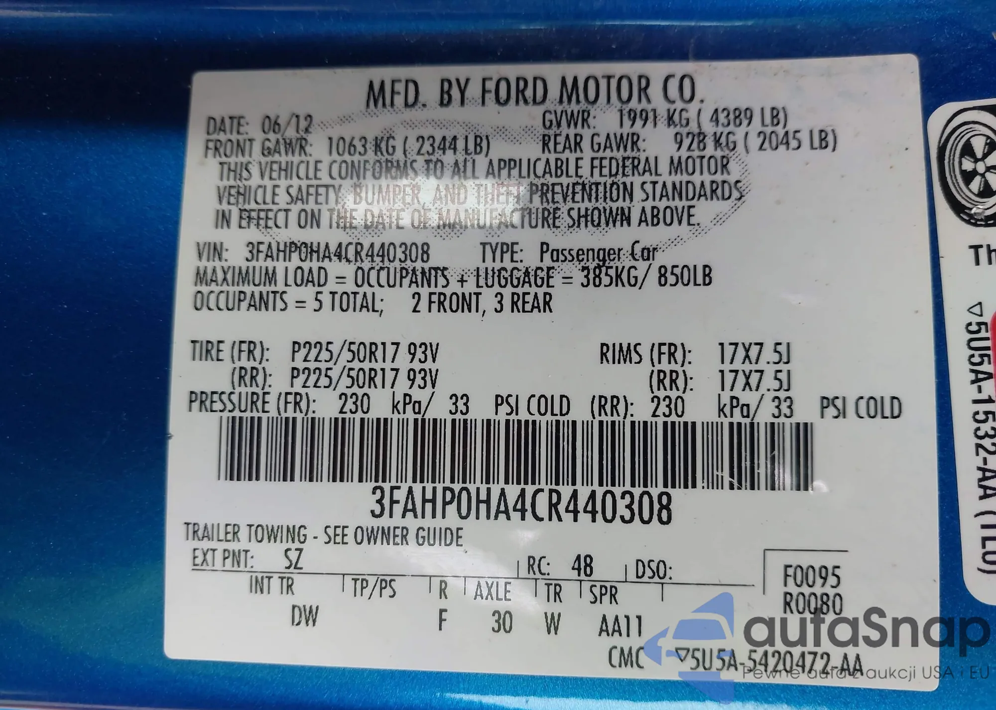 LOT: 43460340 VIN: 3FAHP0HA4CR440308
