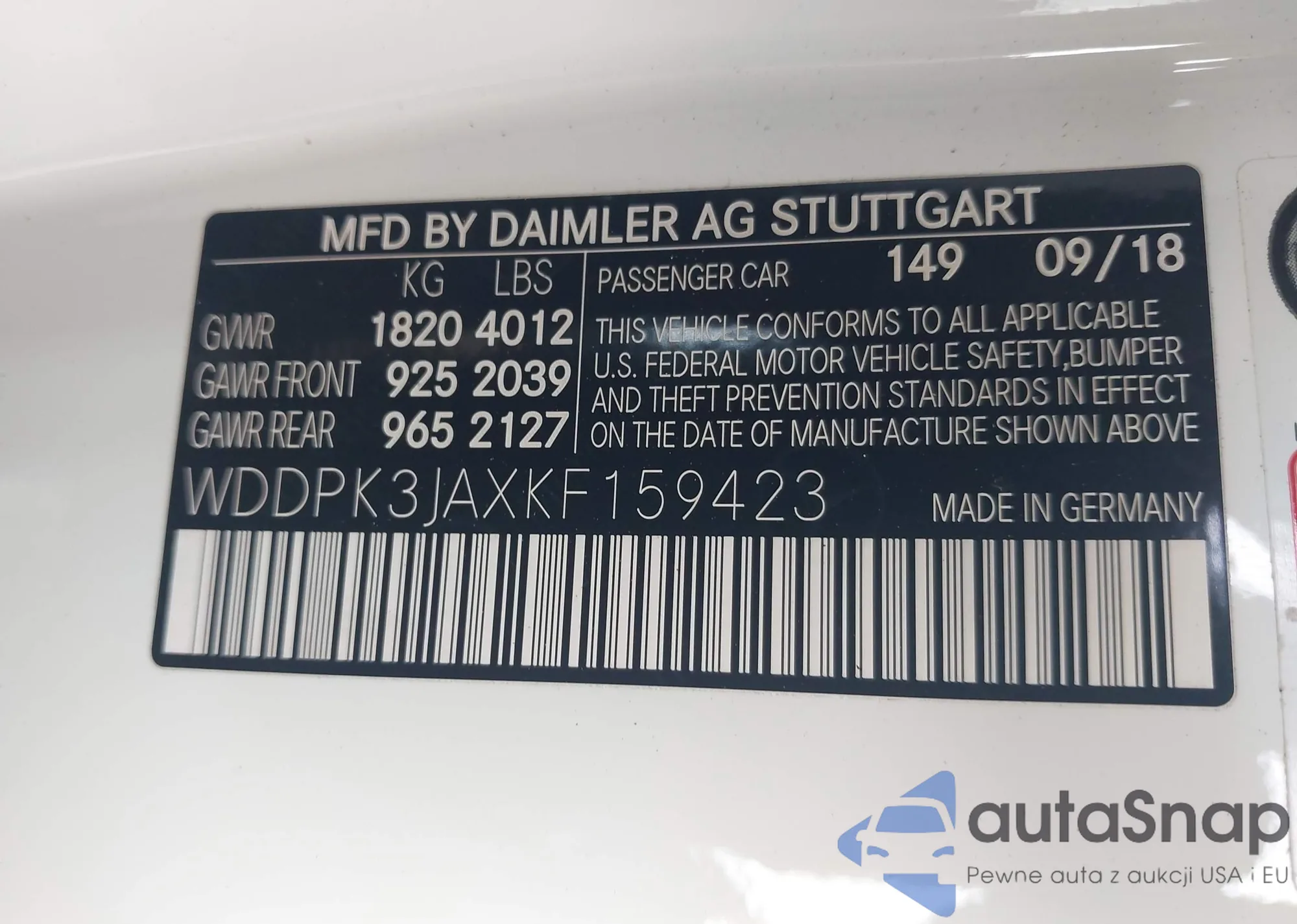 LOT: 43333570 VIN: WDDPK3JAXKF159423