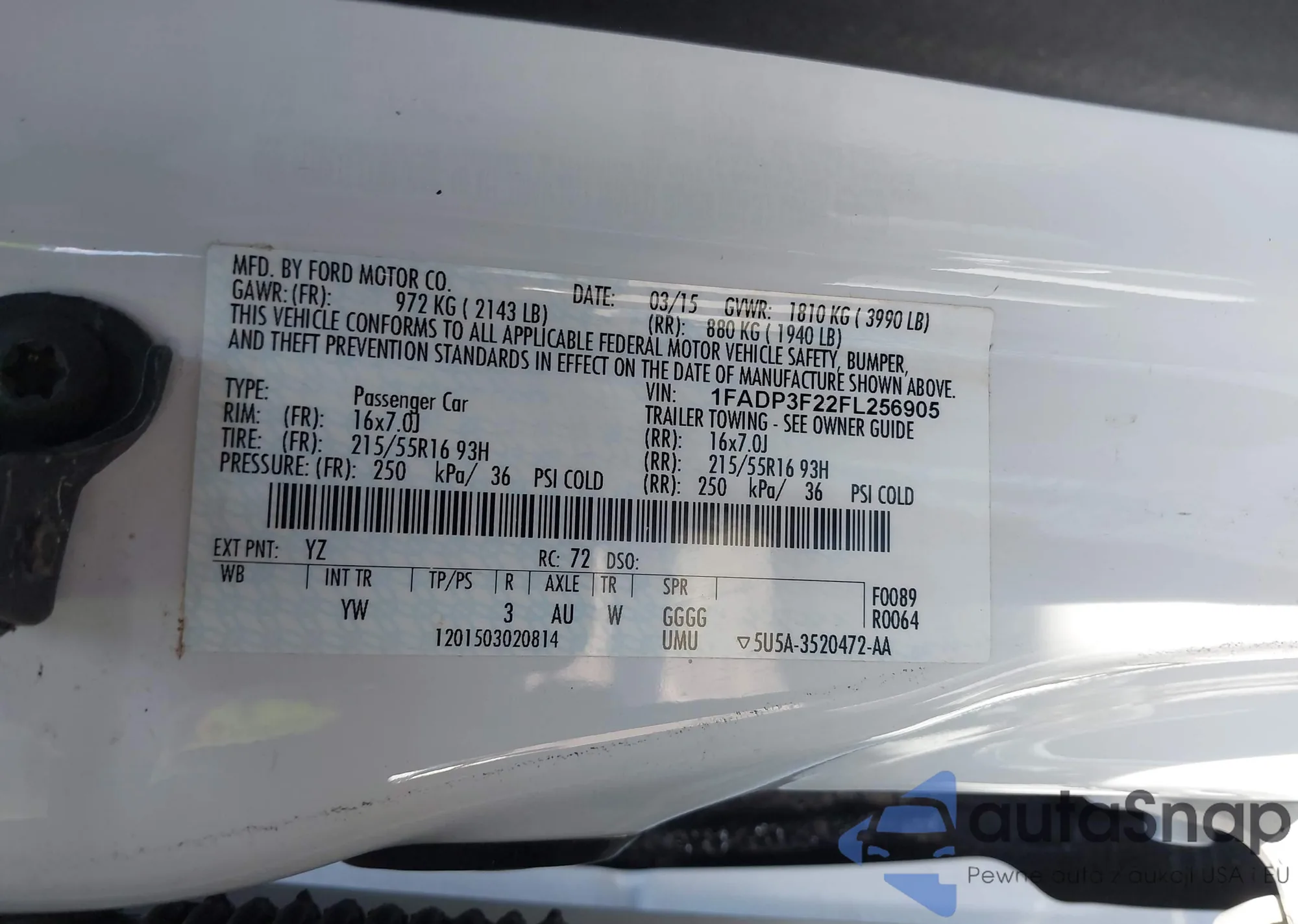 LOT: 43573527 VIN: 1FADP3F22FL256905