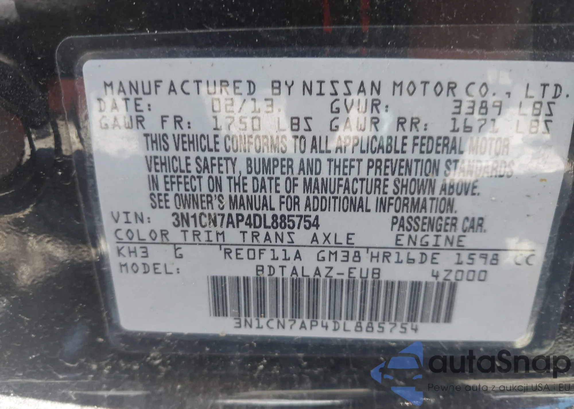 • VIN 3N1CN7AP4DL885754