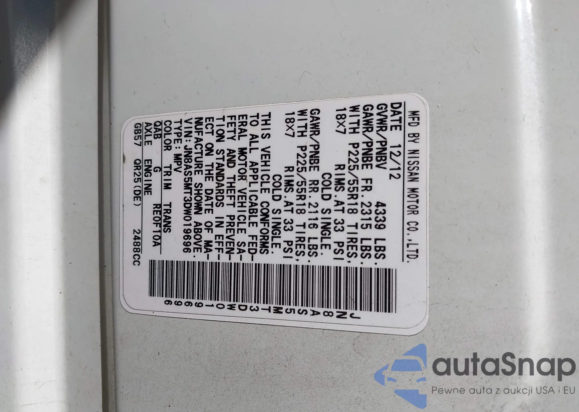 LOT: 43293019 VIN: JN8AS5MT3DW019696