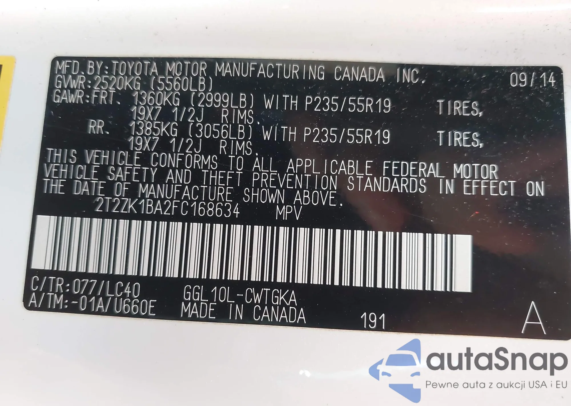 • VIN 2T2ZK1BA2FC168634