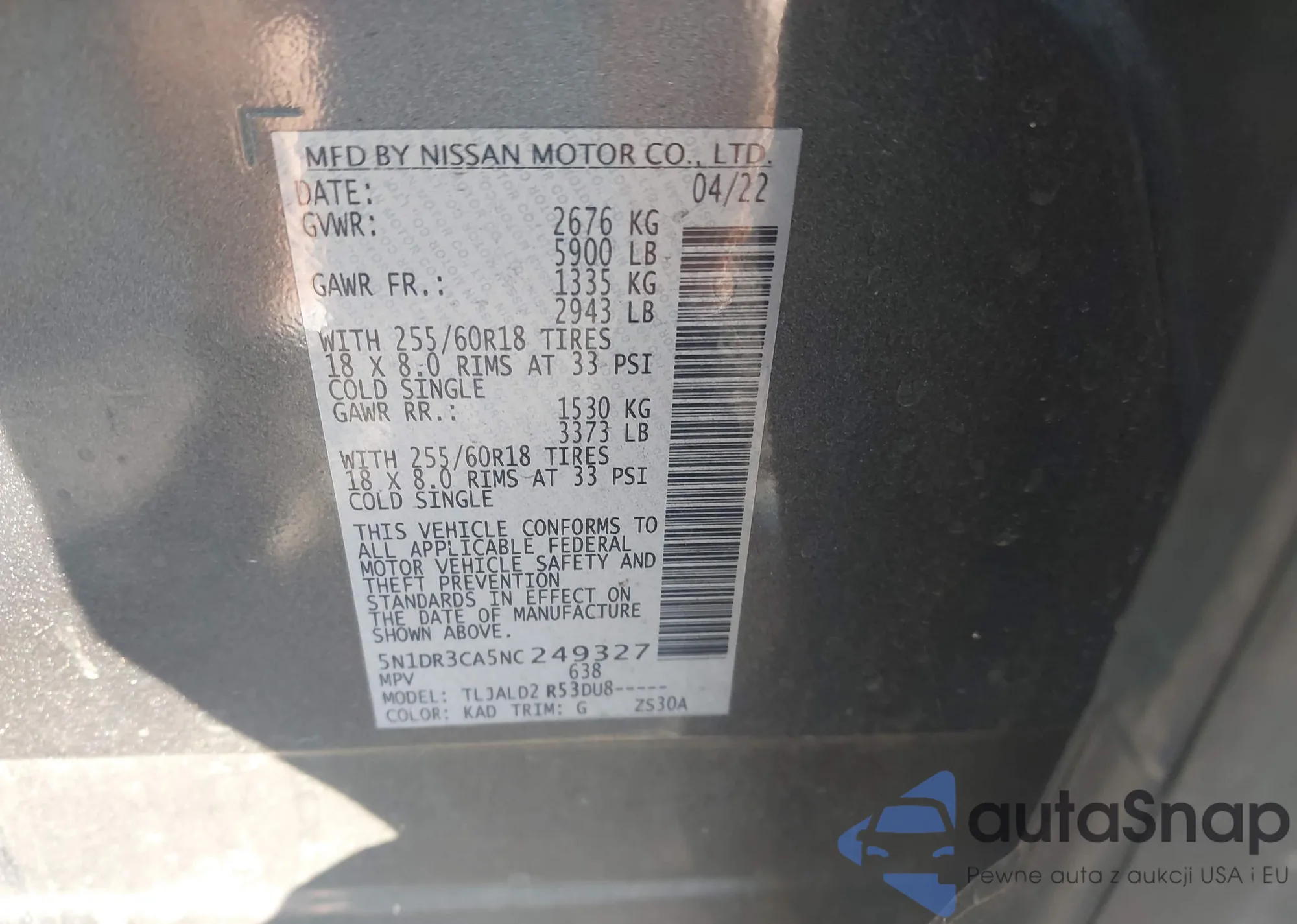 • VIN 5N1DR3CA5NC249327