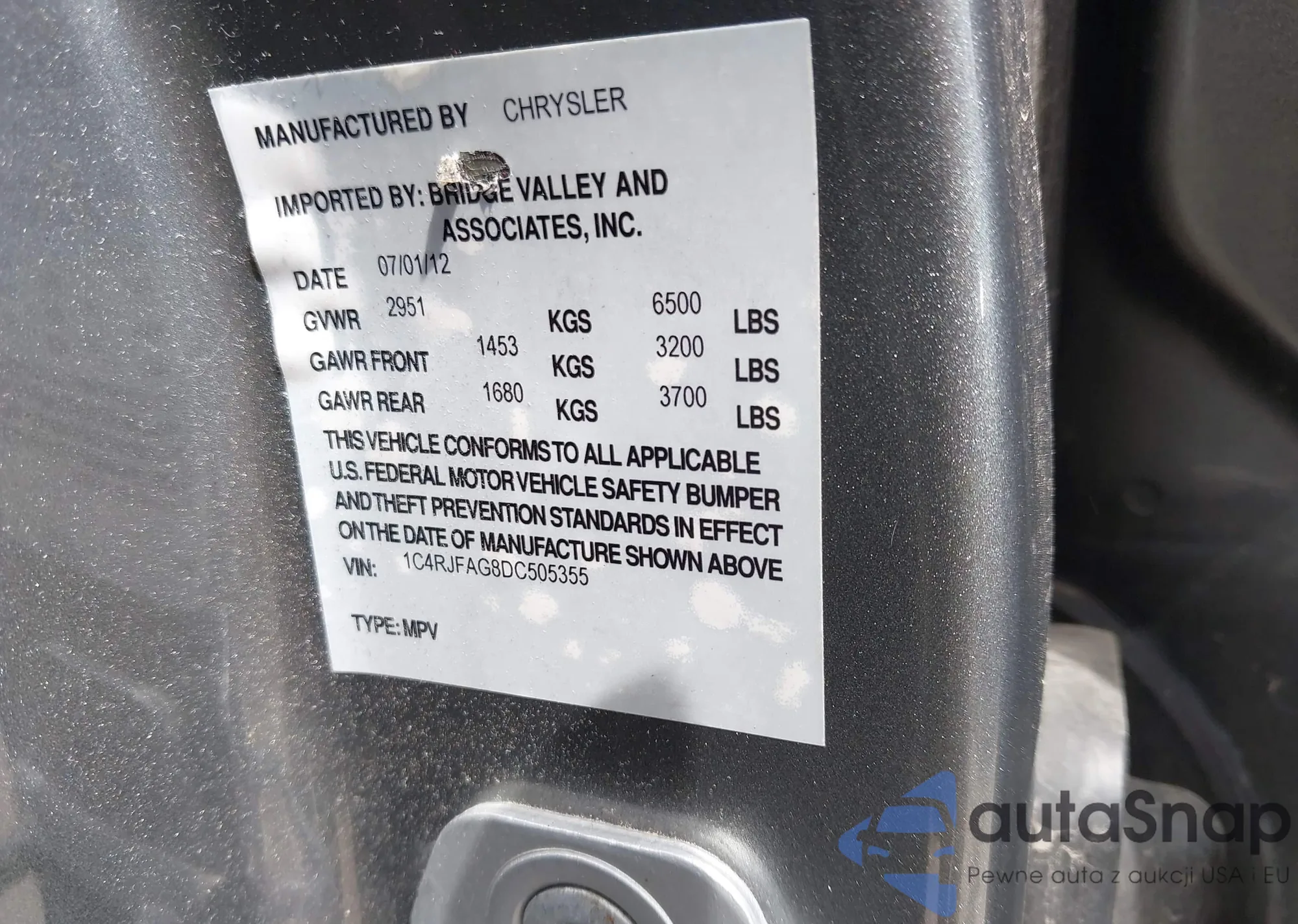 • VIN 1C4RJFAG8DC505355