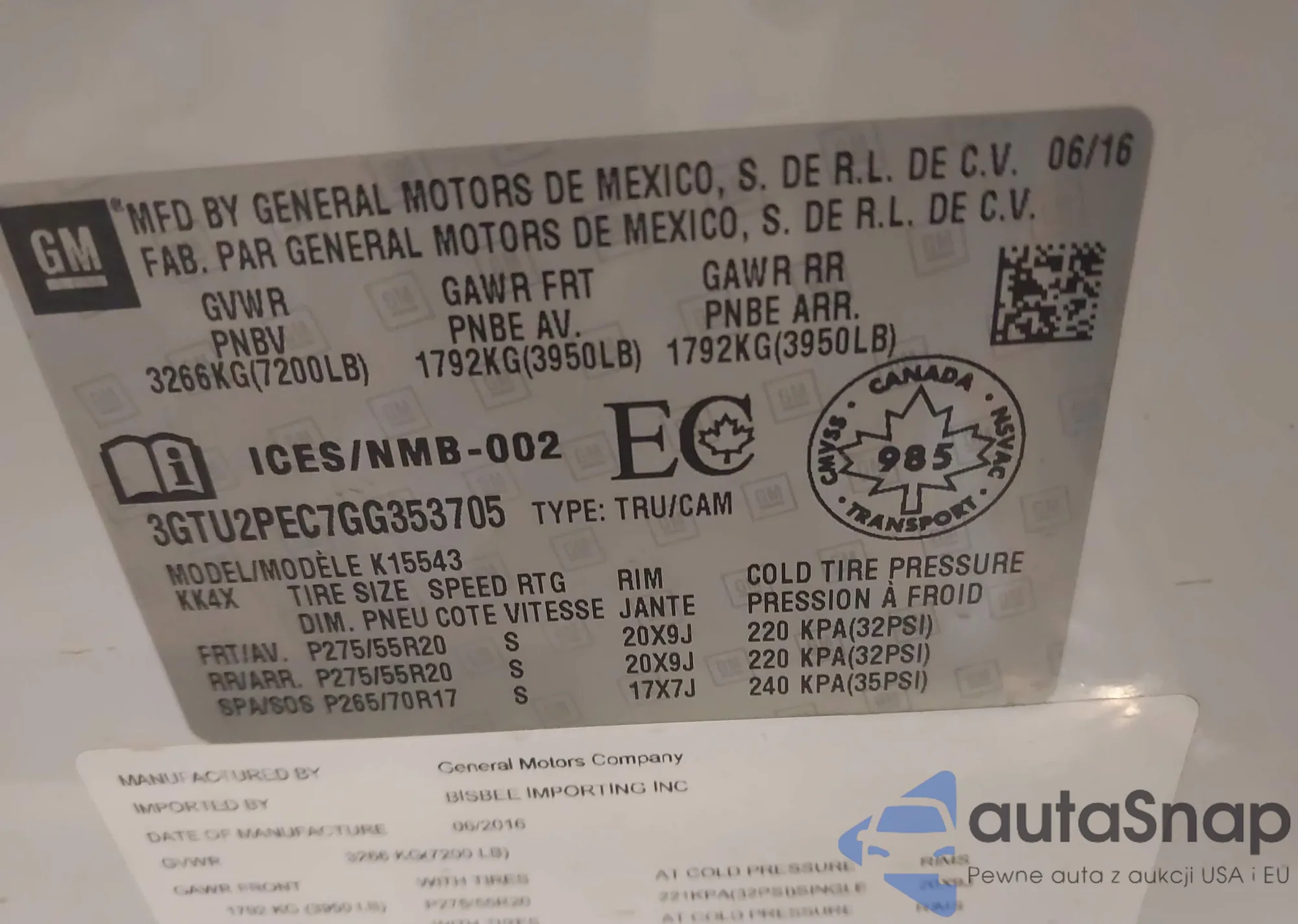 • VIN 3GTU2PEC7GG353705