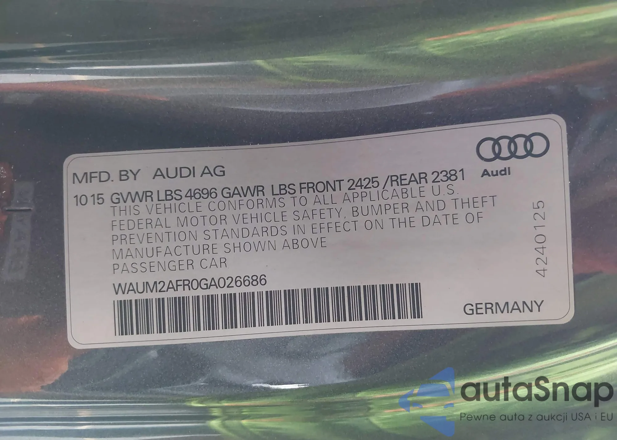 LOT: 43210088 VIN: WAUM2AFR0GA026686