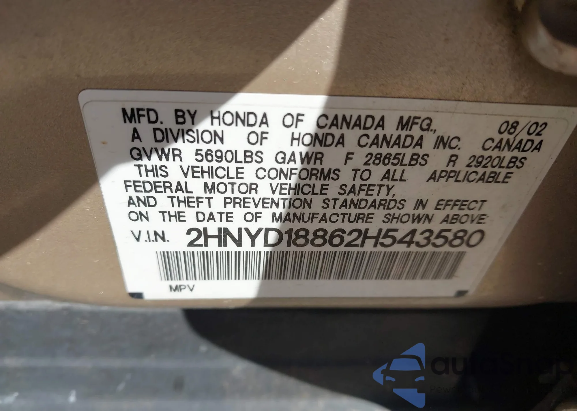 LOT: 43413156 VIN: 2HNYD18862H543580