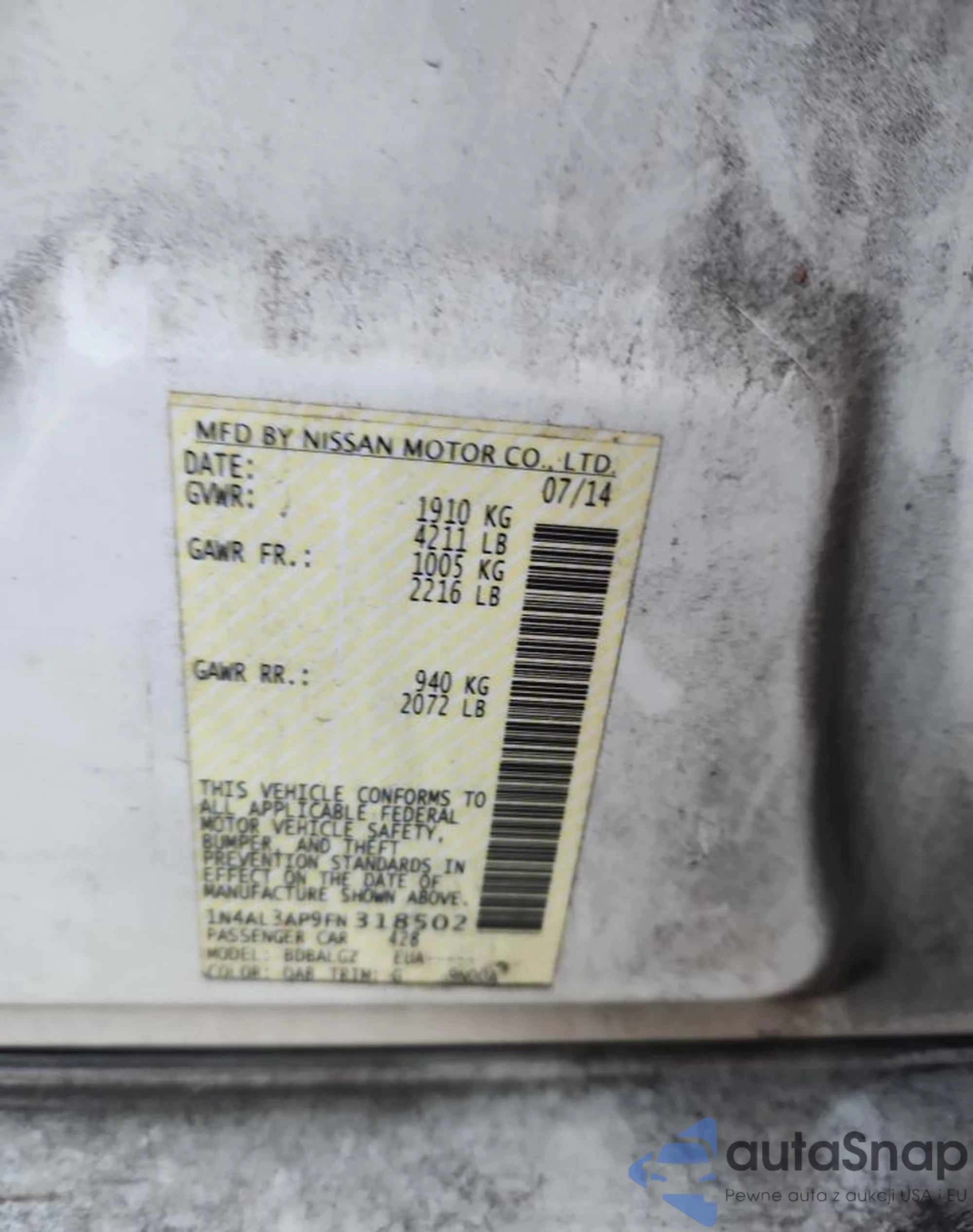 • VIN 1N4AL3AP9FN318502