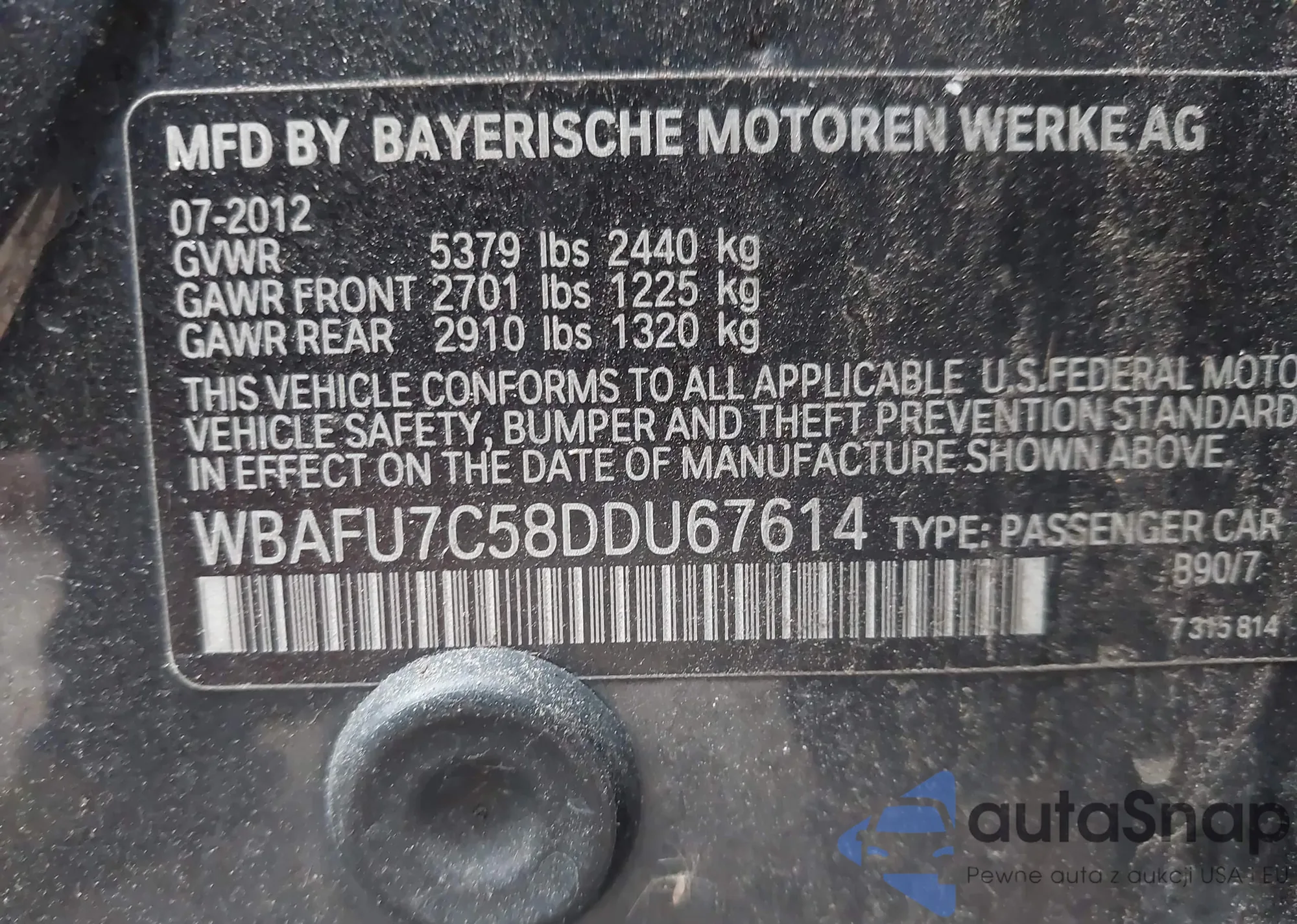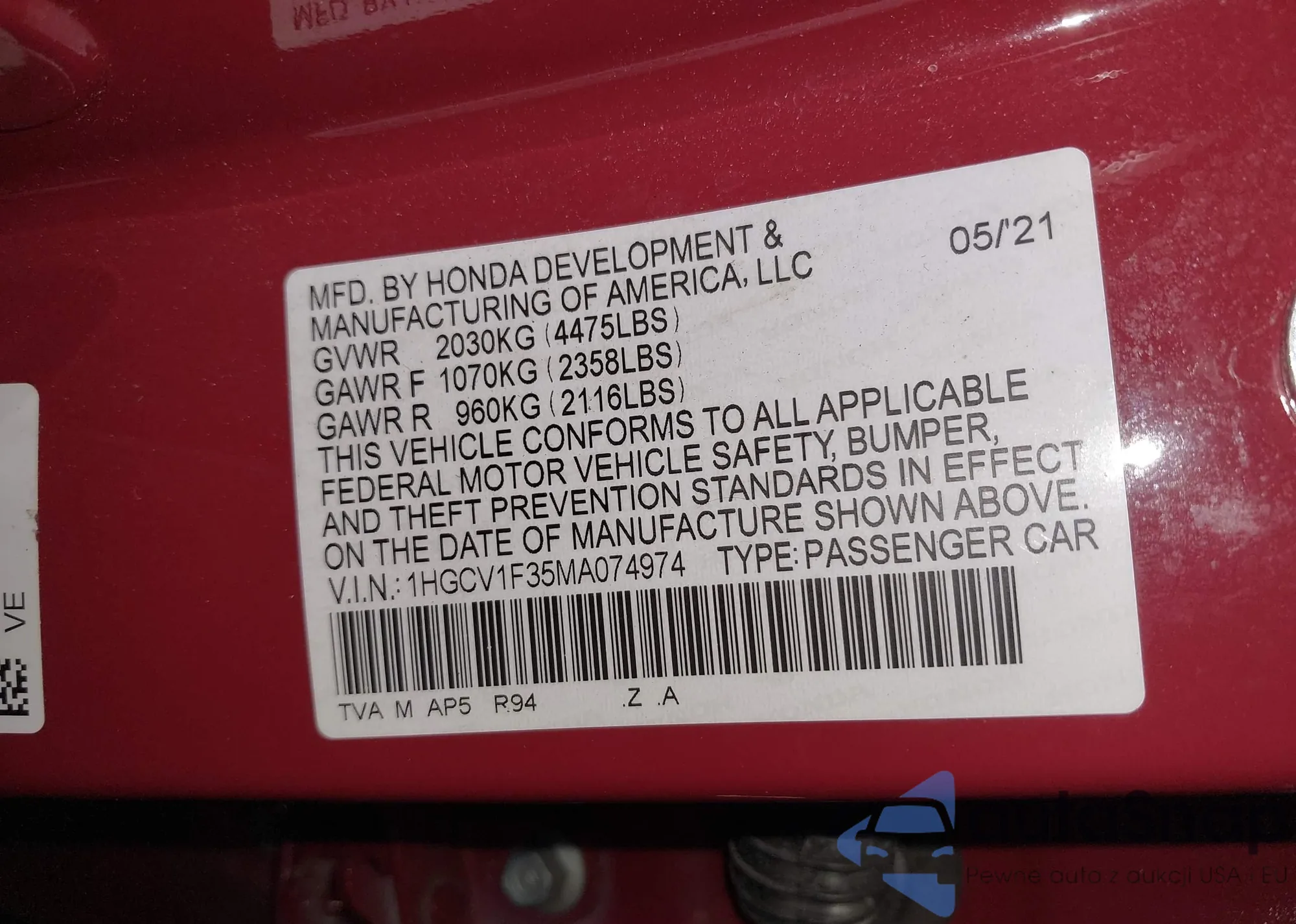 • VIN 5J6RE38367L000449