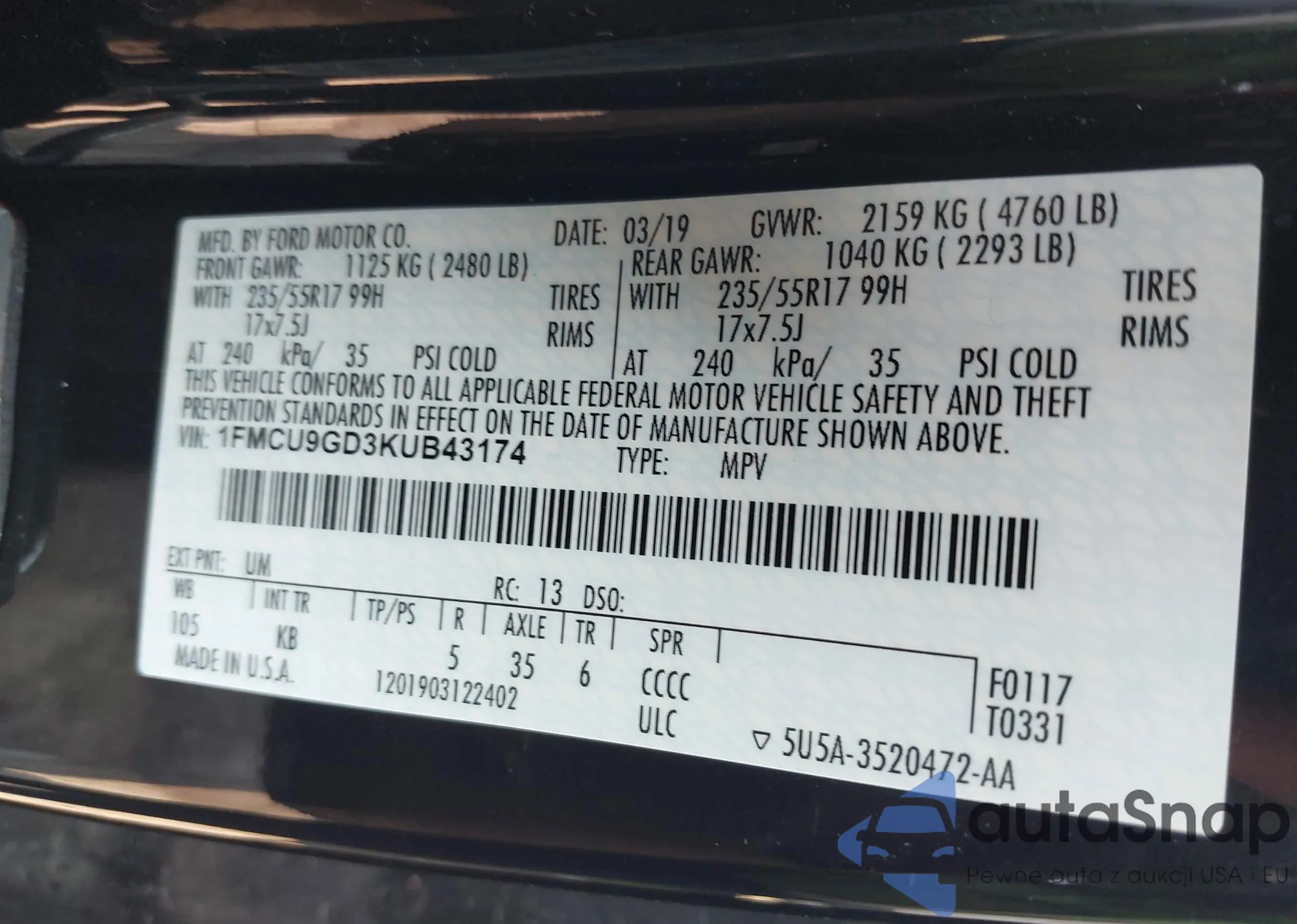 • VIN 1FMCU9GD3KUB43174