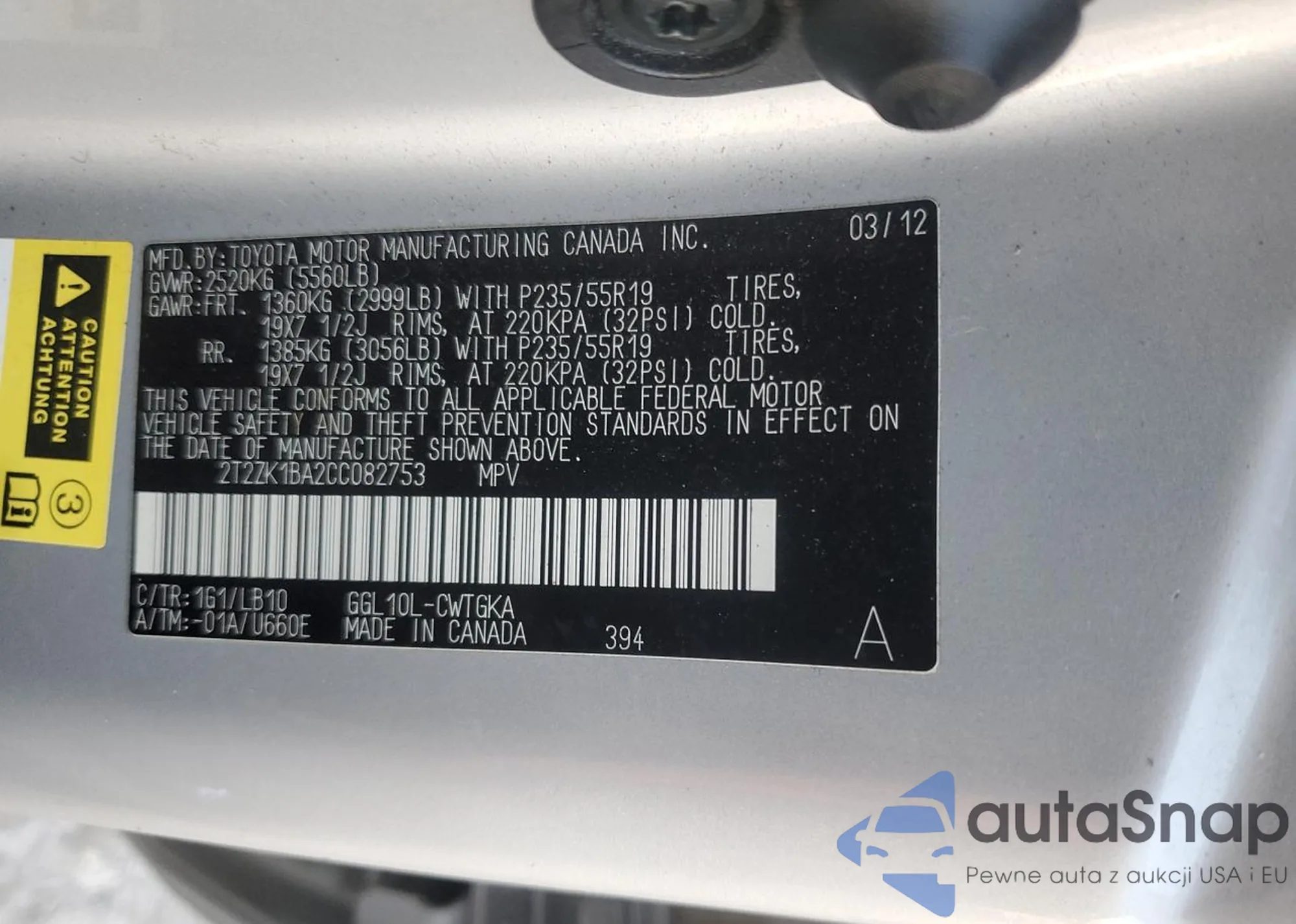 • VIN 2T2ZK1BA2CC082753