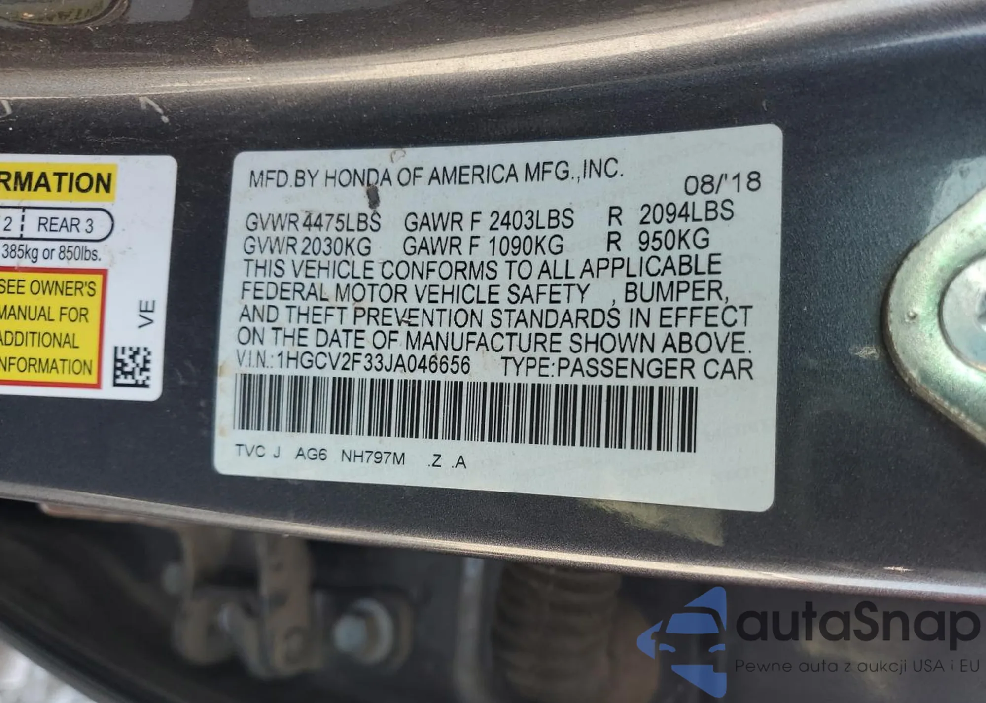 LOT: 80951745 VIN: 1HGCV2F33JA046656
