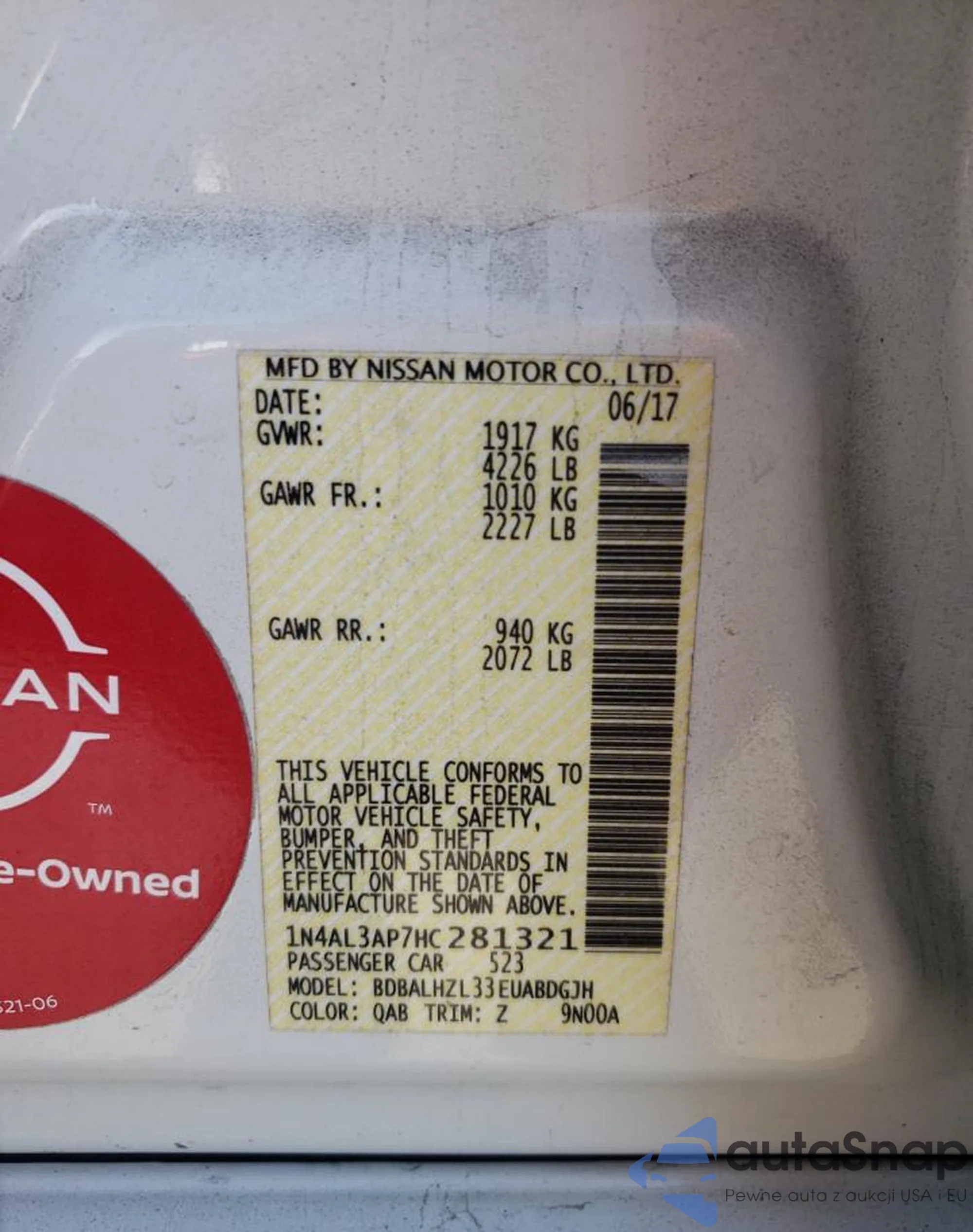• VIN 1N4AL3AP7HC281321