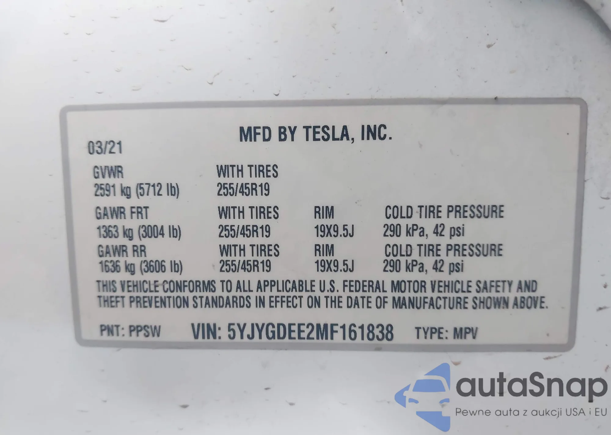 LOT: 43299059 VIN: 5YJ3E1EA4MF096115