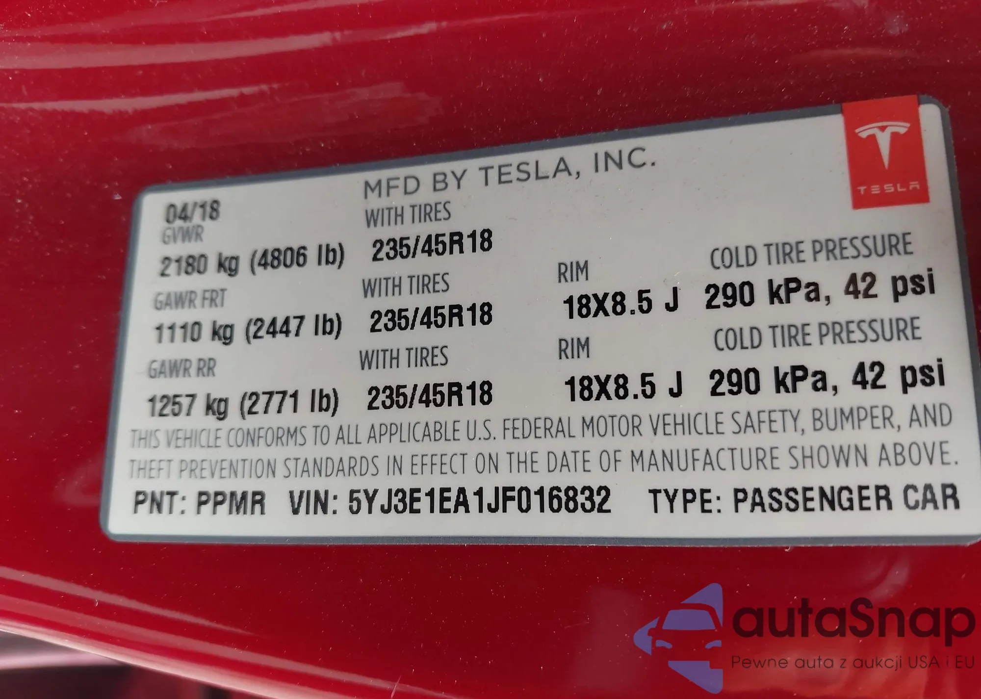 • VIN 5YJ3E1EA1JF016832