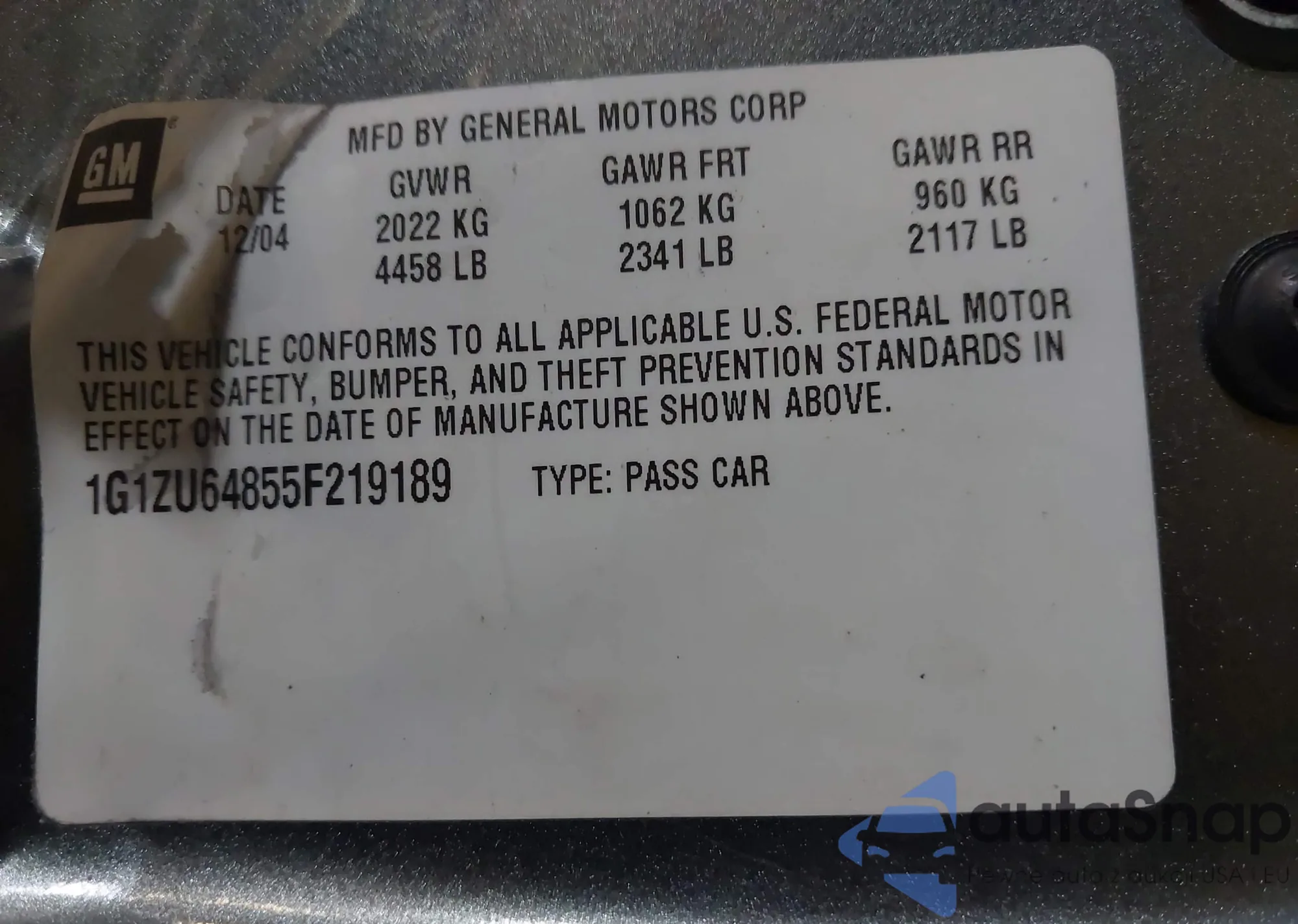 LOT: 43348835 VIN: 1G1ZU64855F219189