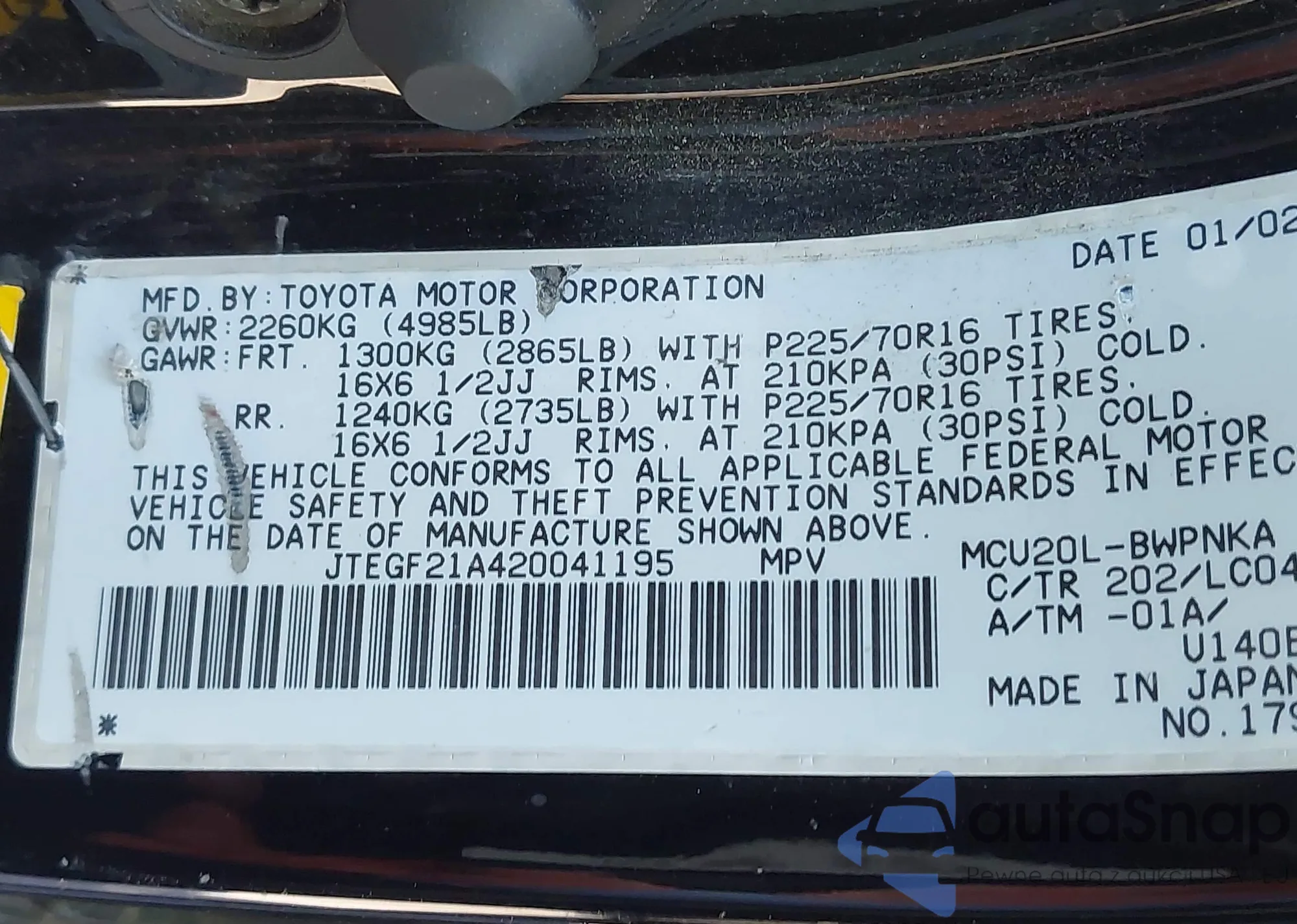 LOT: 43410467 VIN: JTDBR32E470103196