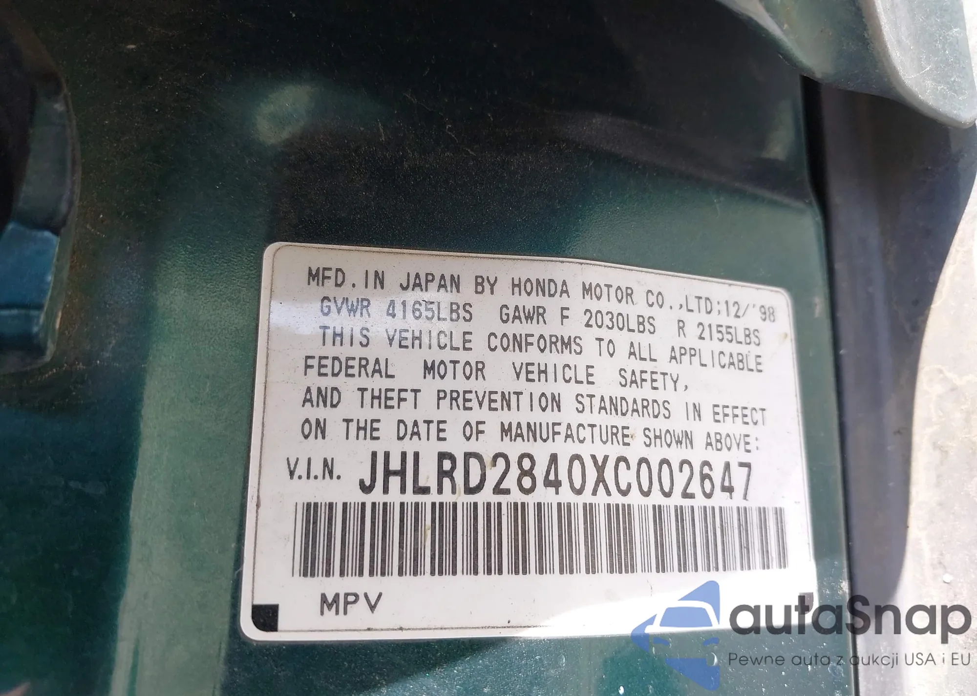 • VIN JHLRD2840XC002647