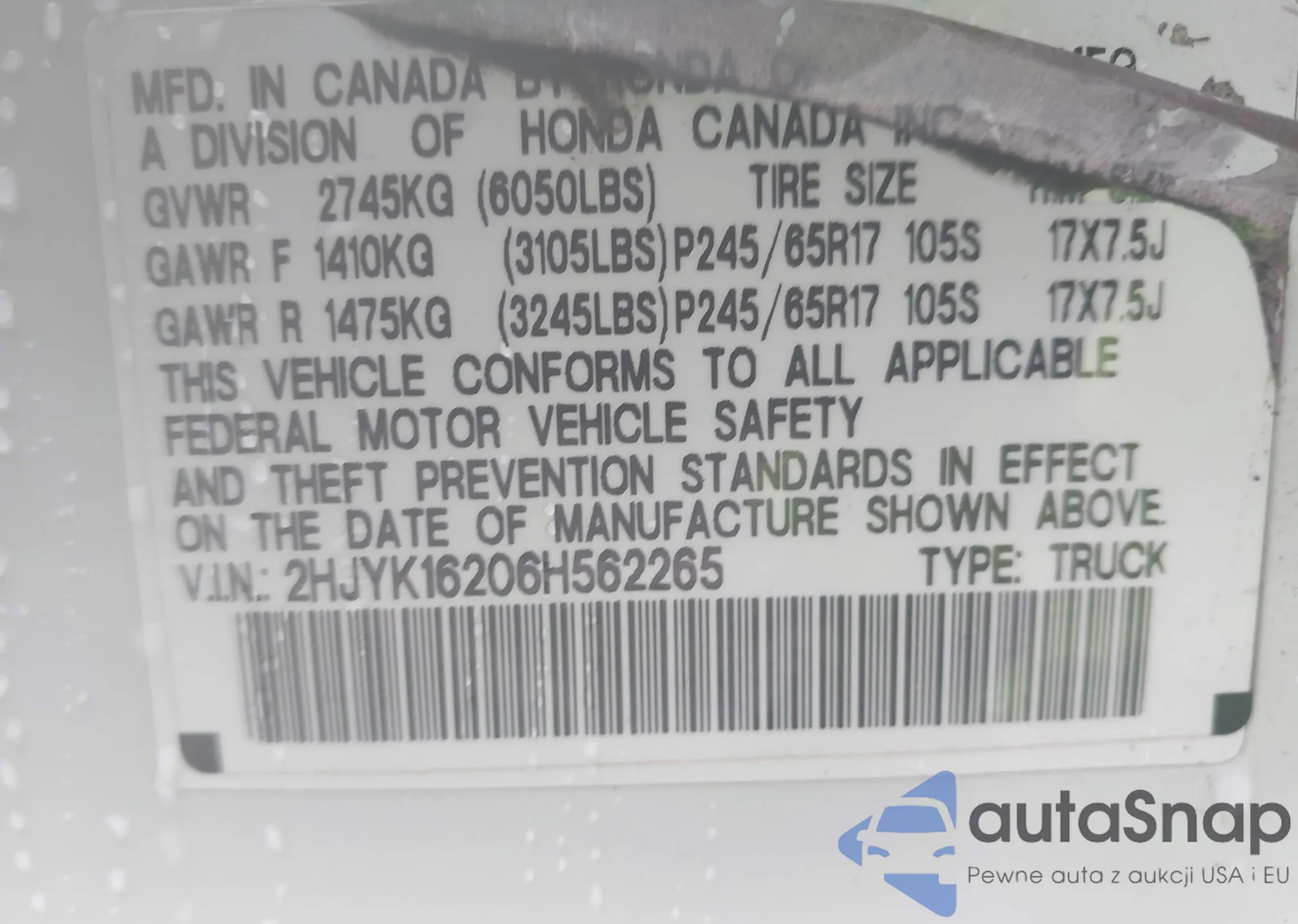 • VIN 2HJYK16206H562265
