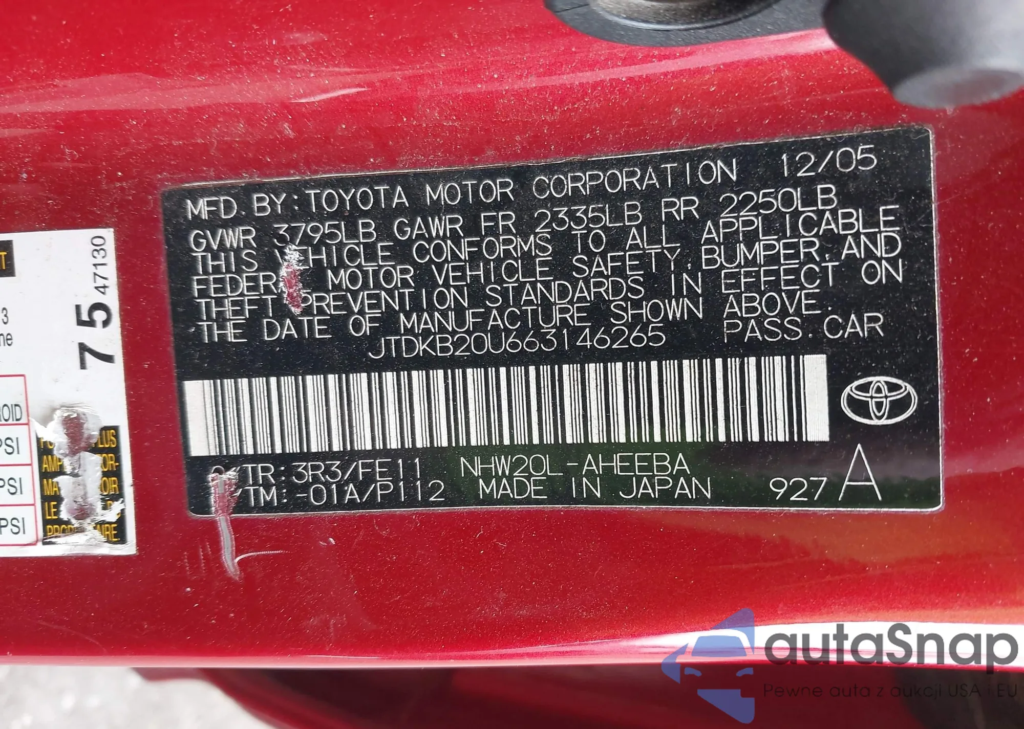 LOT: 43383730 VIN: JTDKB20U663146265