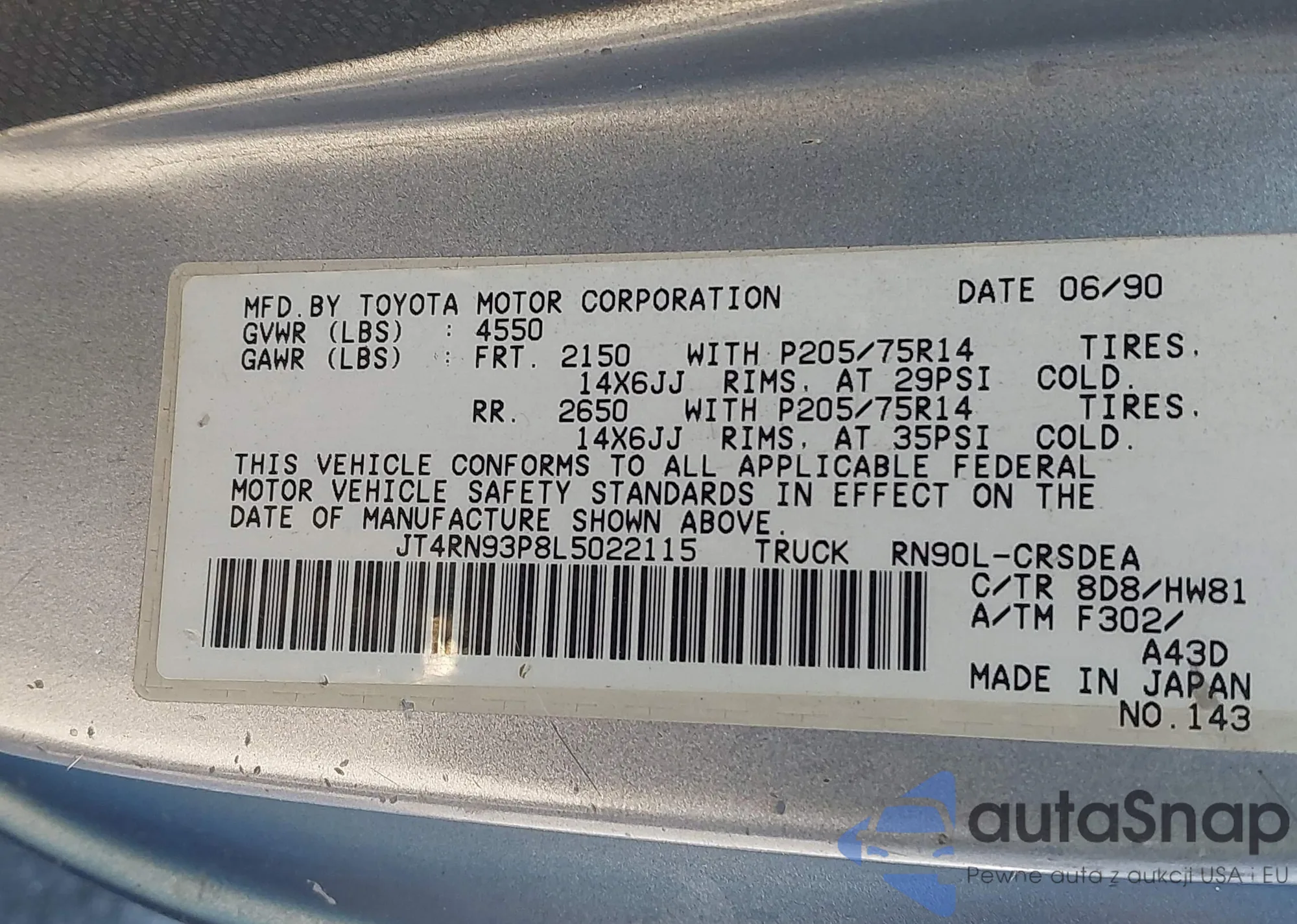 LOT: 43496703 VIN: JT4RN93P8L5022115