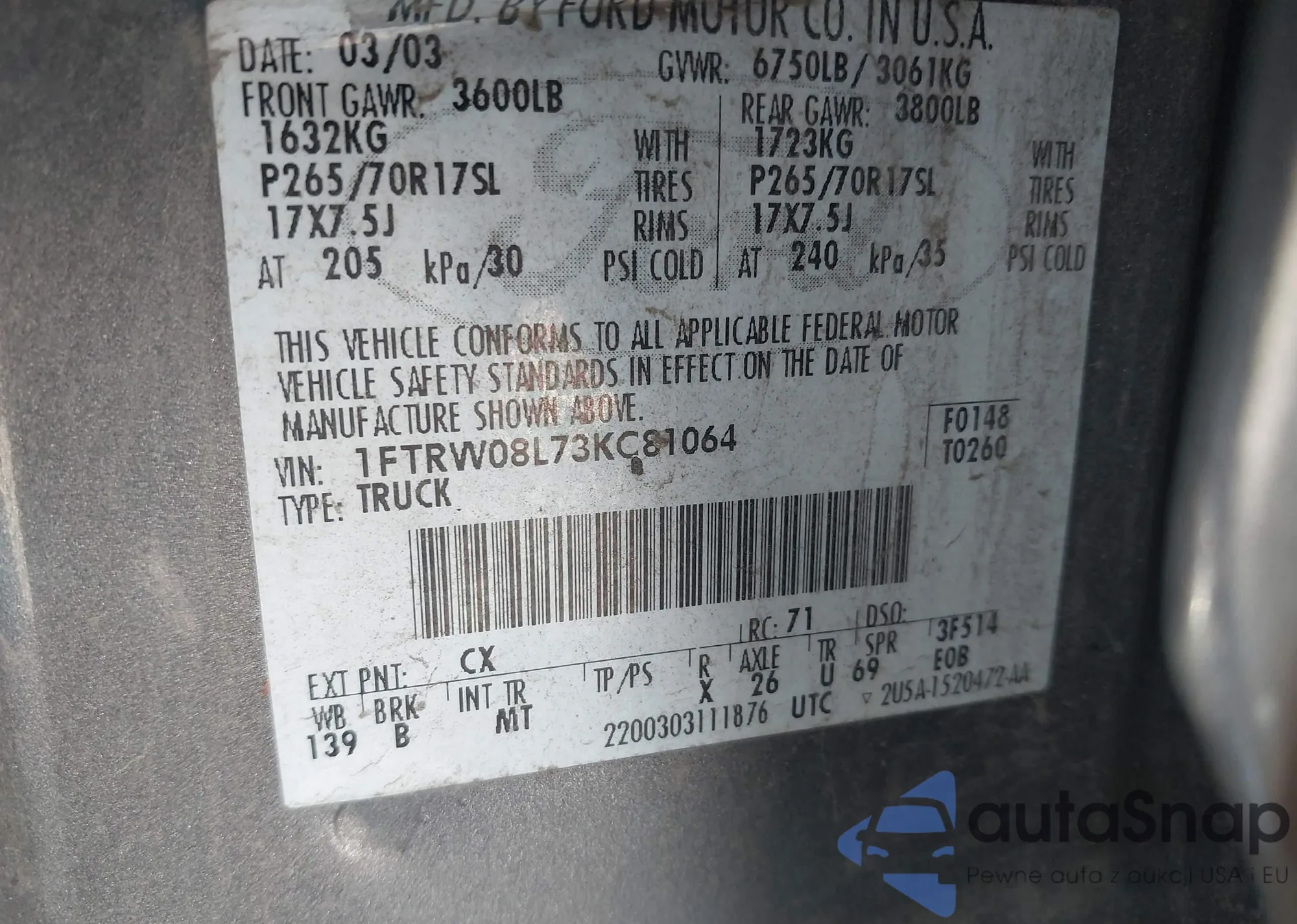 LOT: 43530585 VIN: 1FTRW08L73KC81064