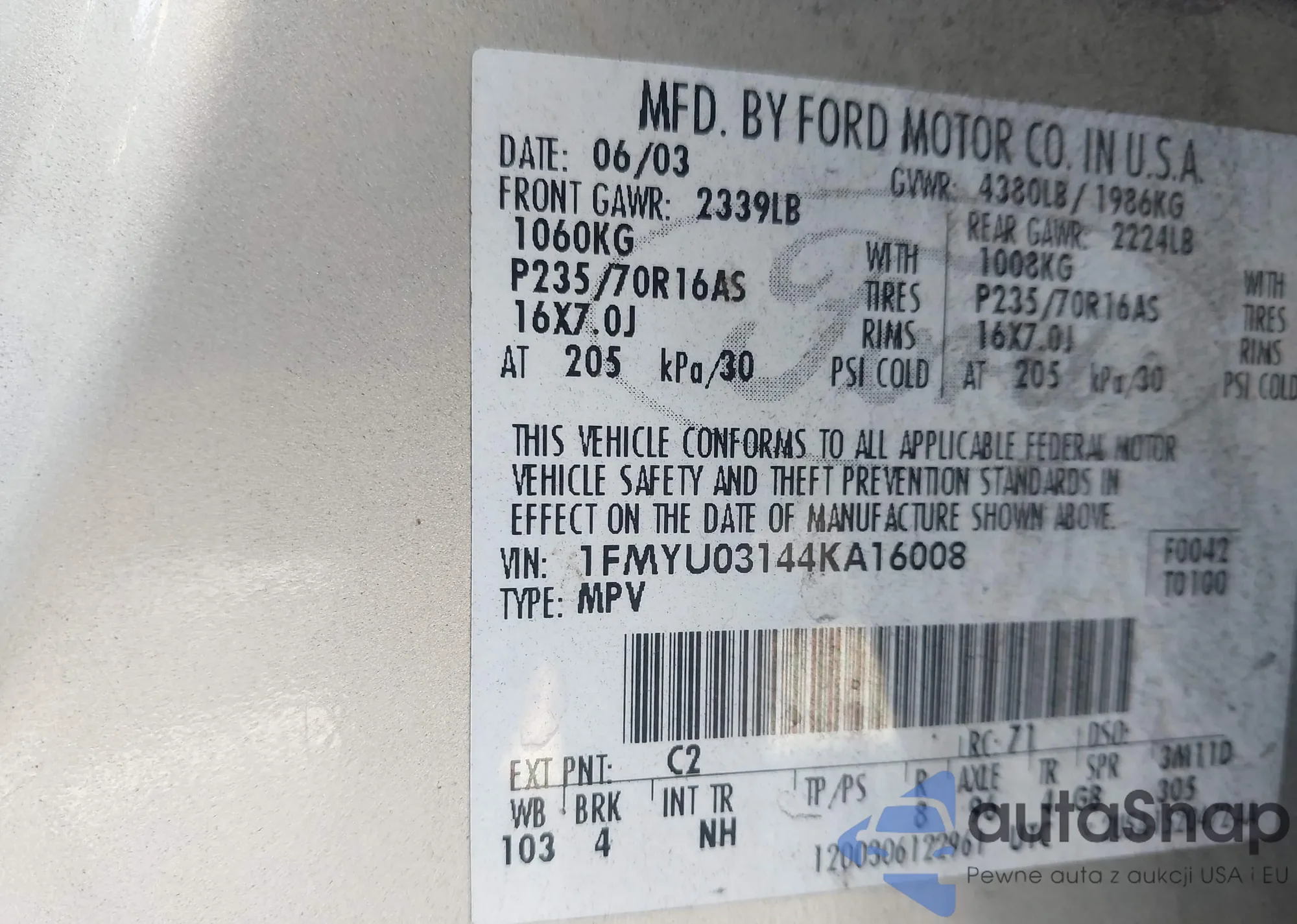 • VIN 1FMYU03144KA16008