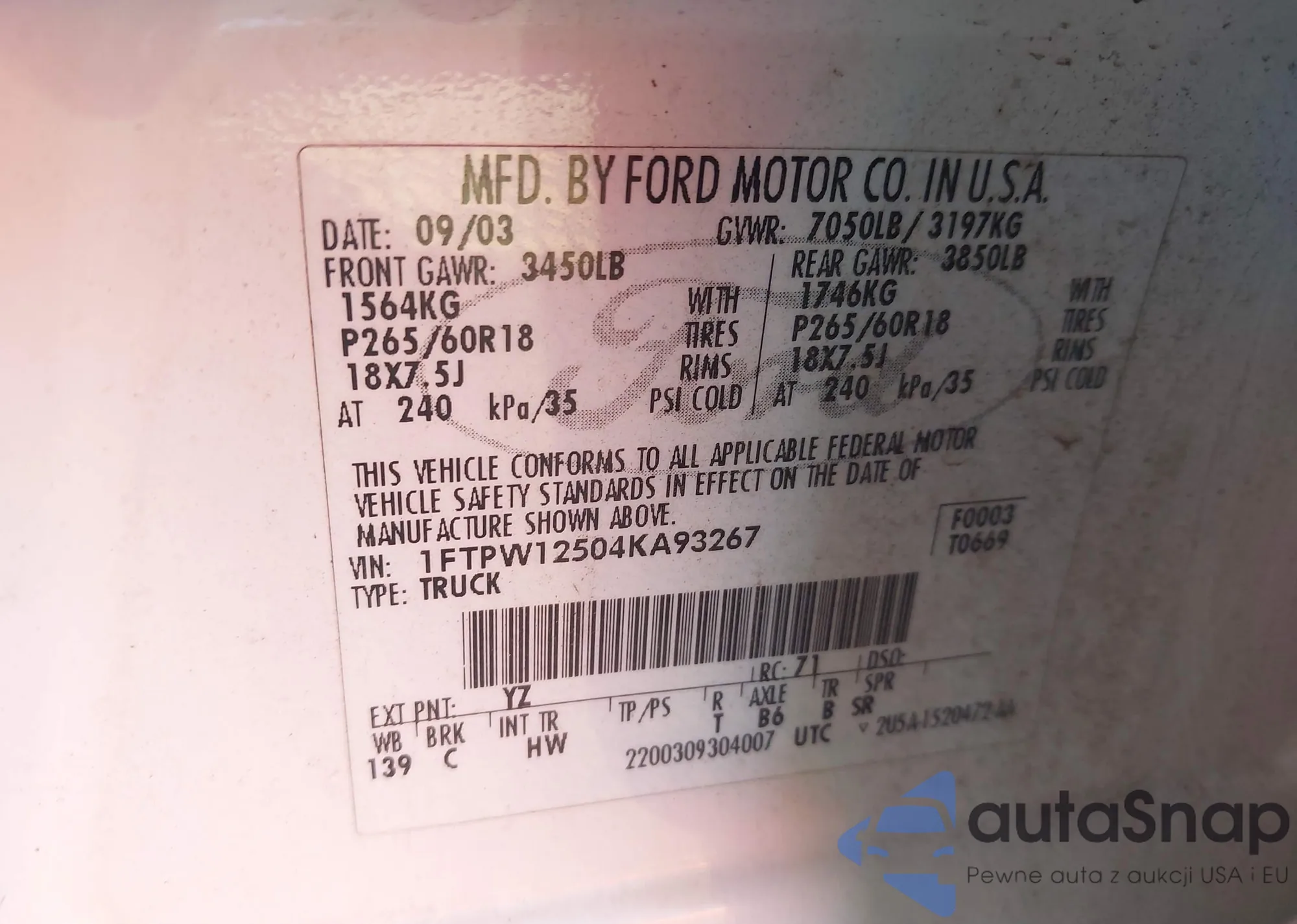 LOT: 43360482 VIN: 1FTRW12869FB26629