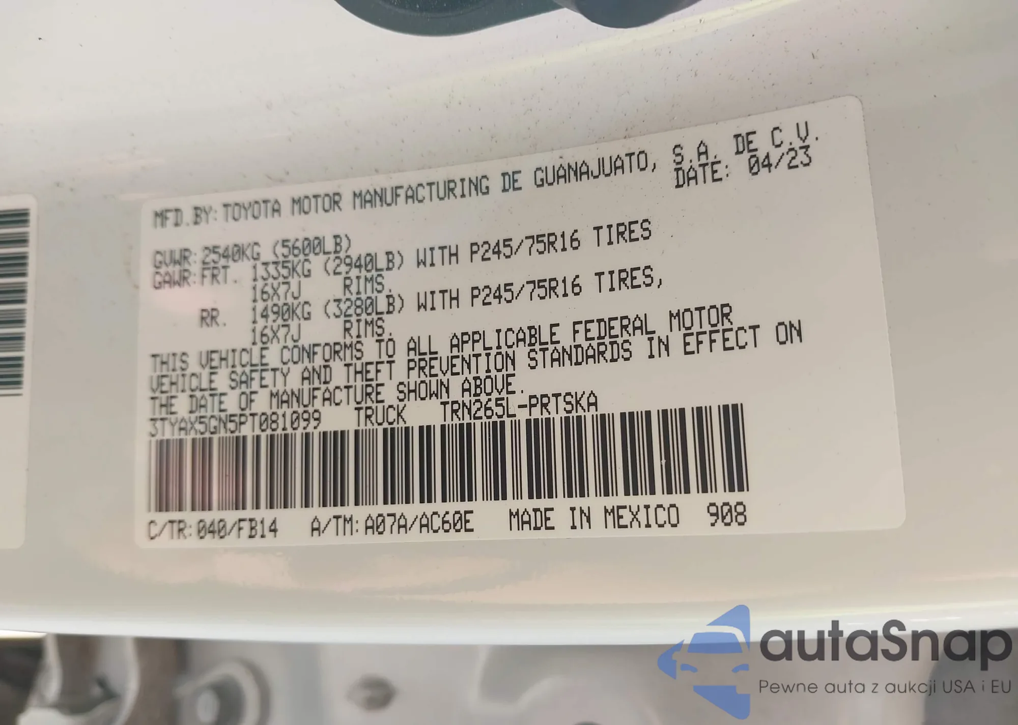 LOT: 43386045 VIN: 3TYAX5GN5PT081099
