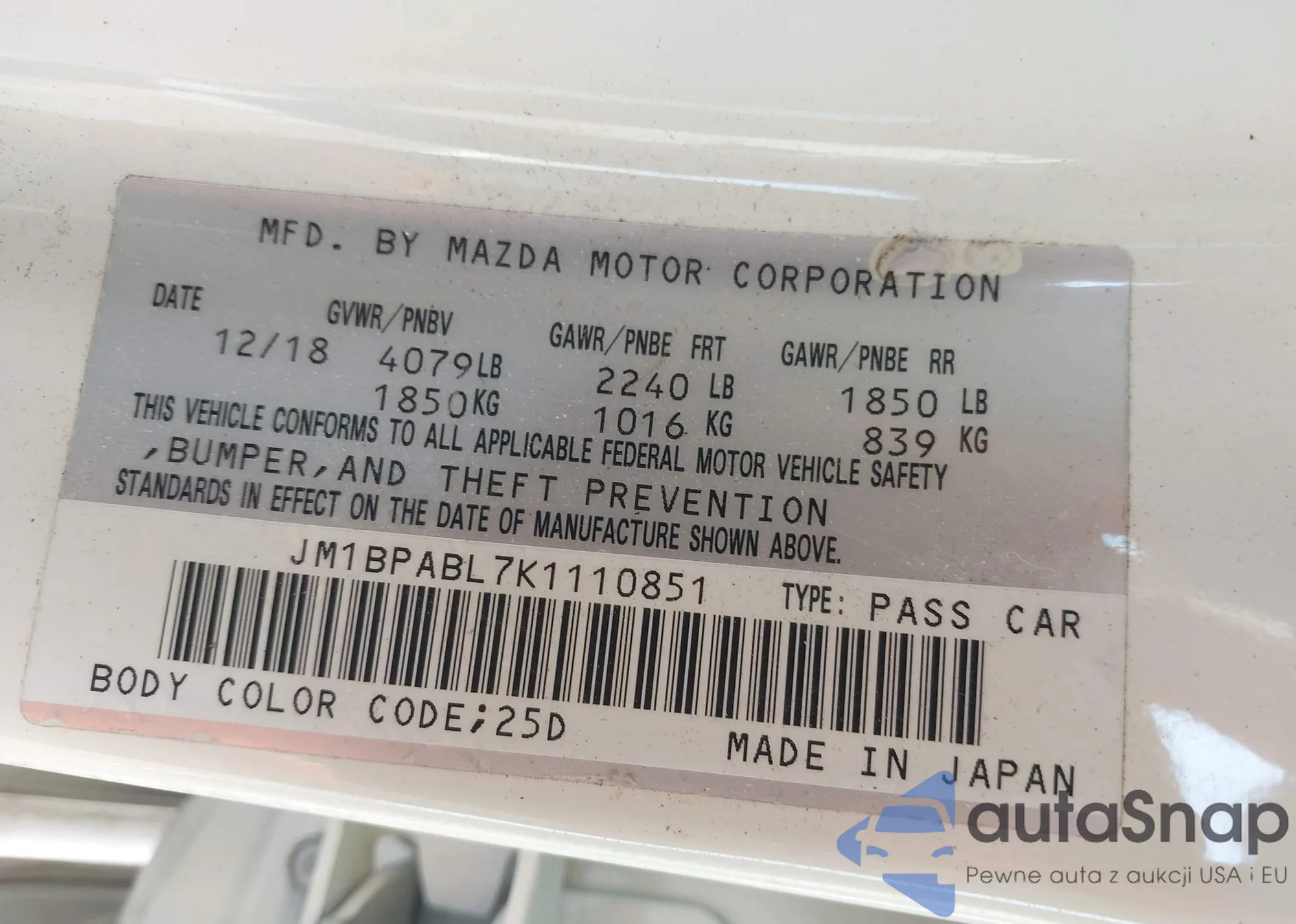 LOT: 43204765 VIN: JM1BPABL7K1110851