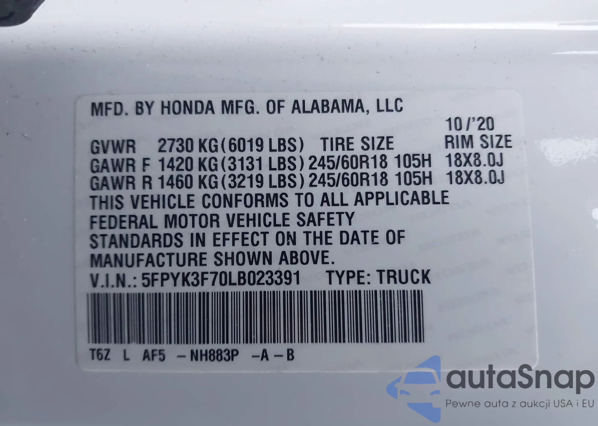 • VIN 5FPYK3F70LB023391