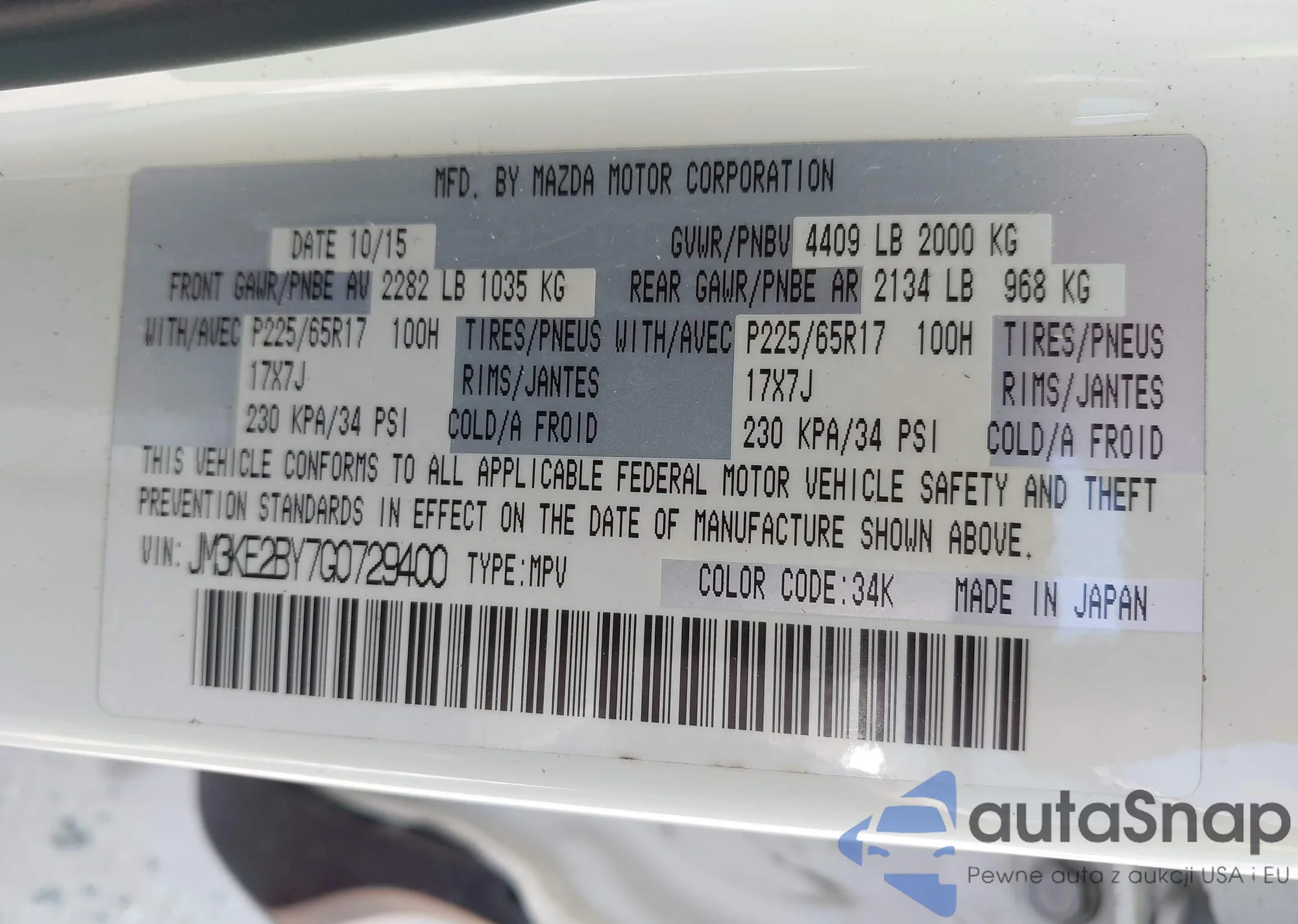 LOT: 43223987 VIN: JM3KE2BY7G0729400