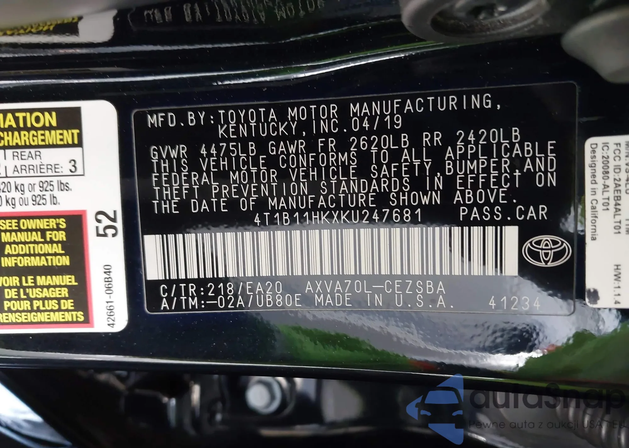 • VIN 4T1B11HKXKU247681
