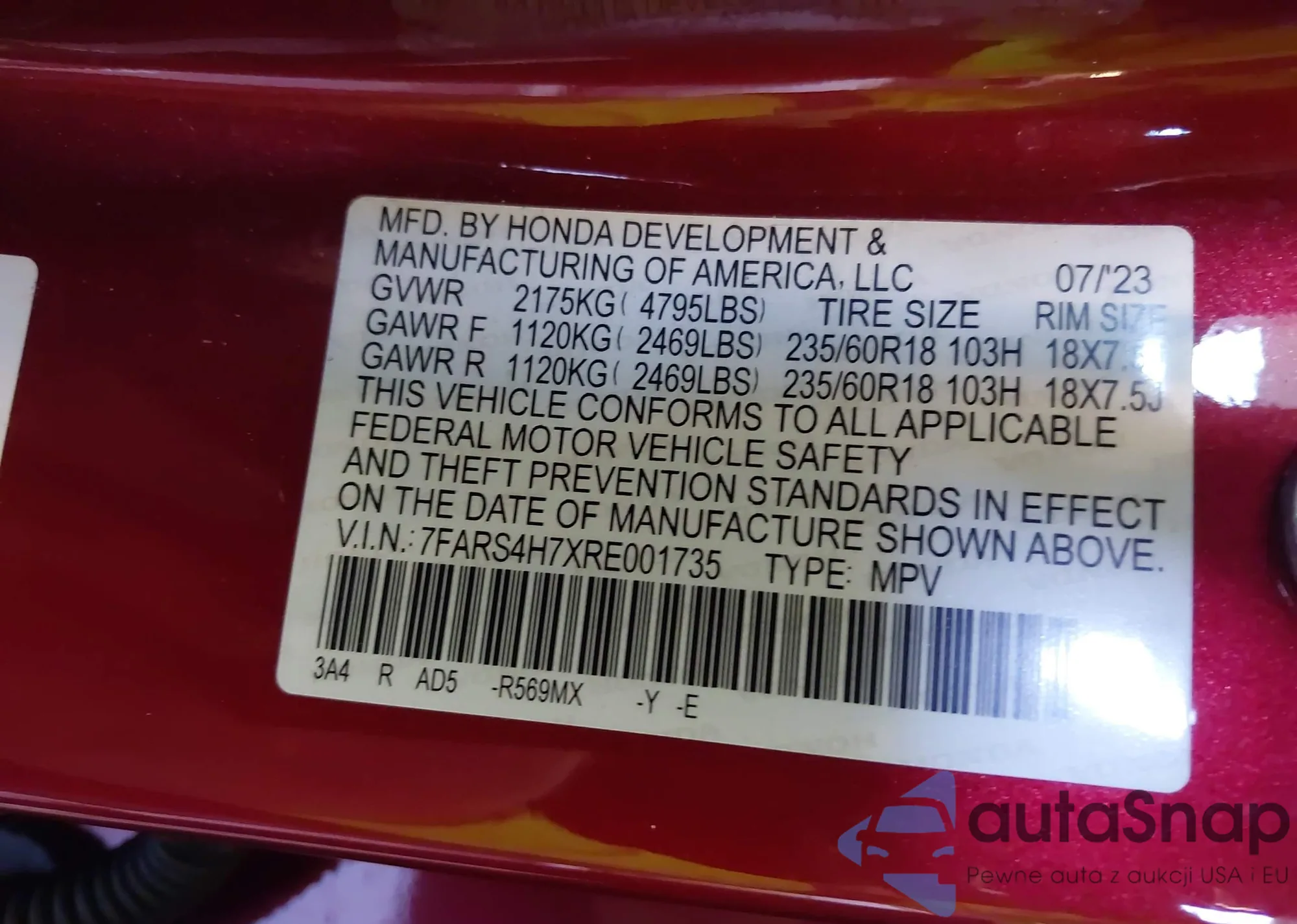 LOT: 43270189 VIN: 7FARS4H7XRE001735