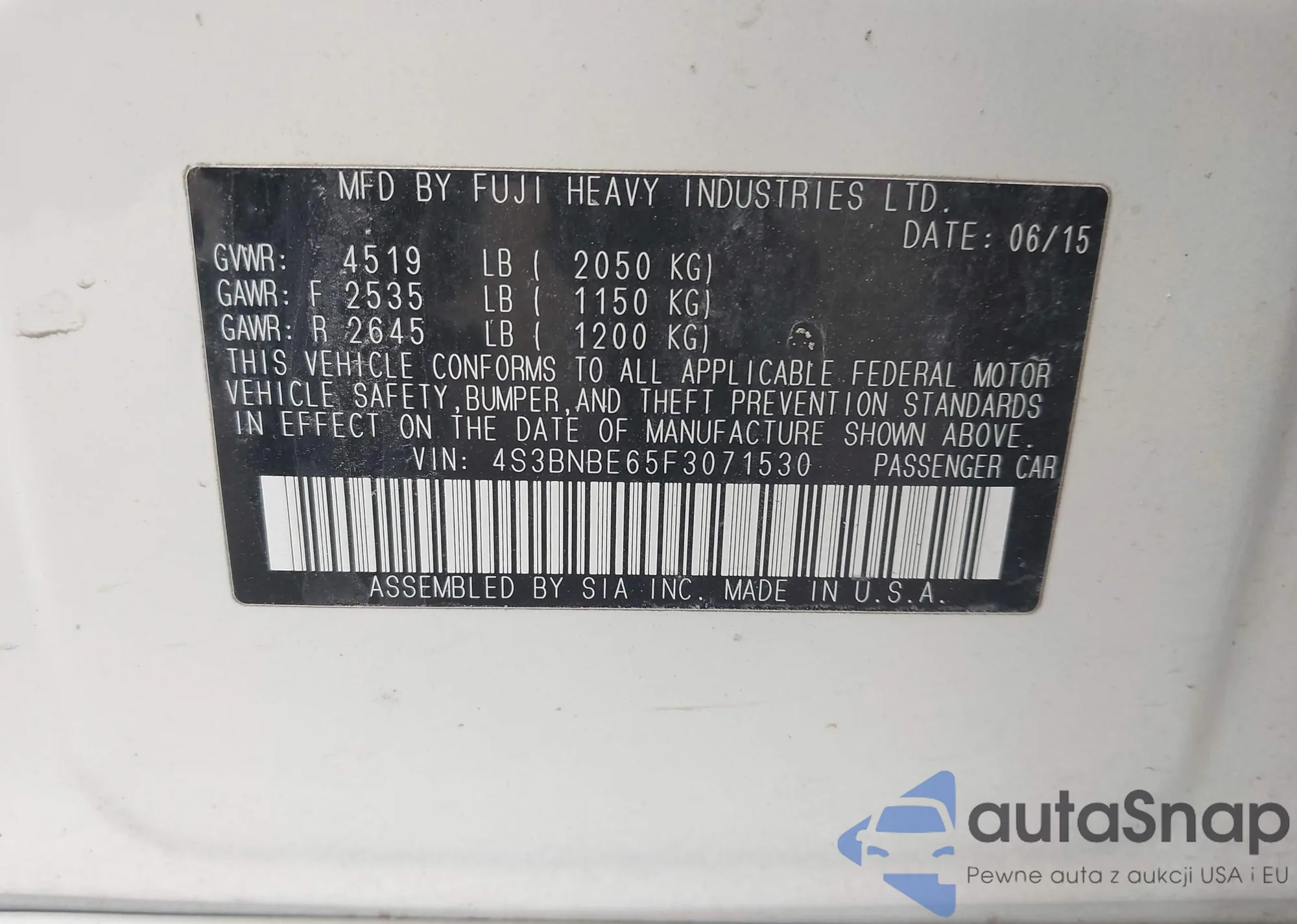 LOT: 43347122 VIN: 4S3BNBE65F3071530