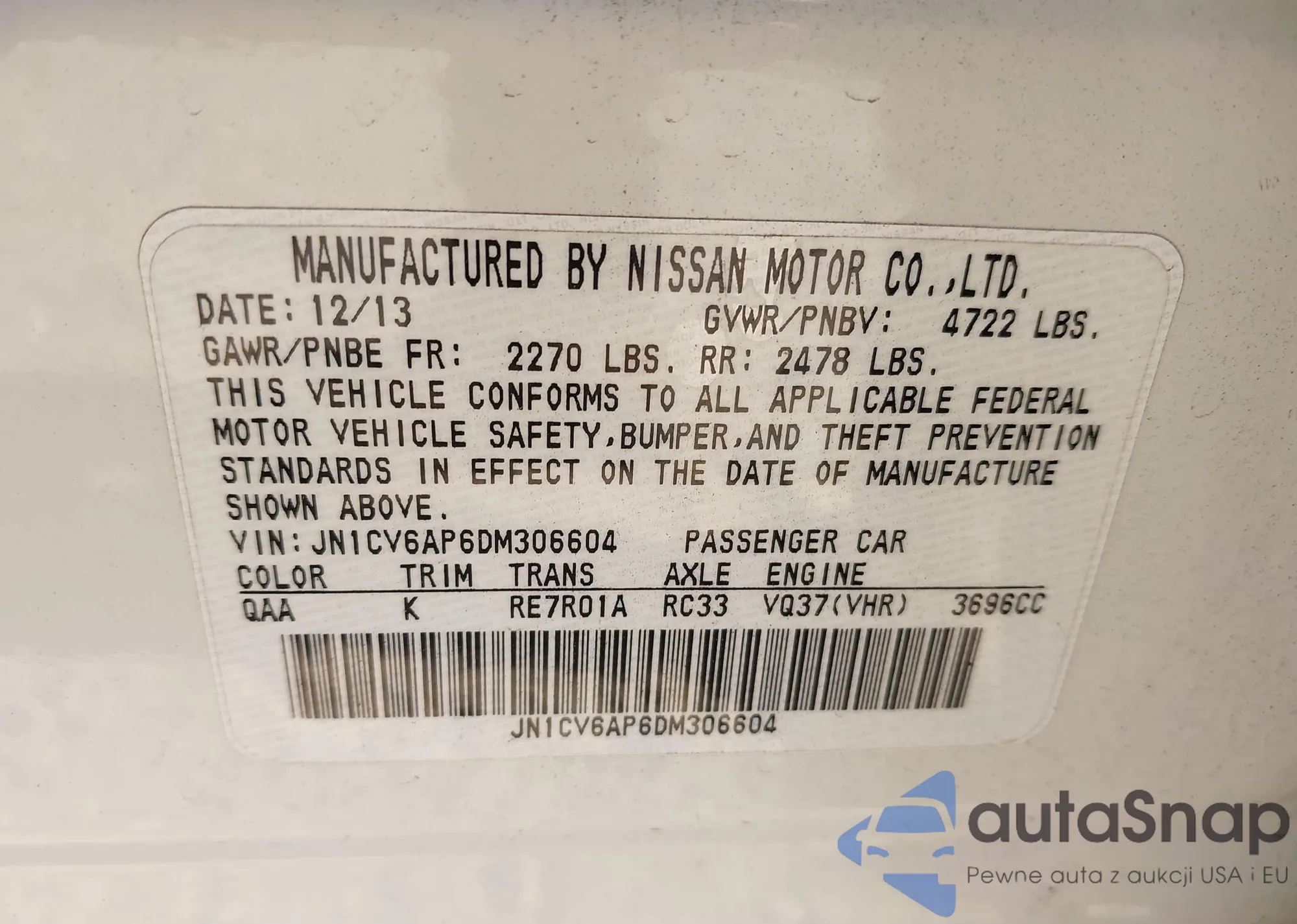 LOT: 43356338 VIN: JN1CV6AP6DM306604