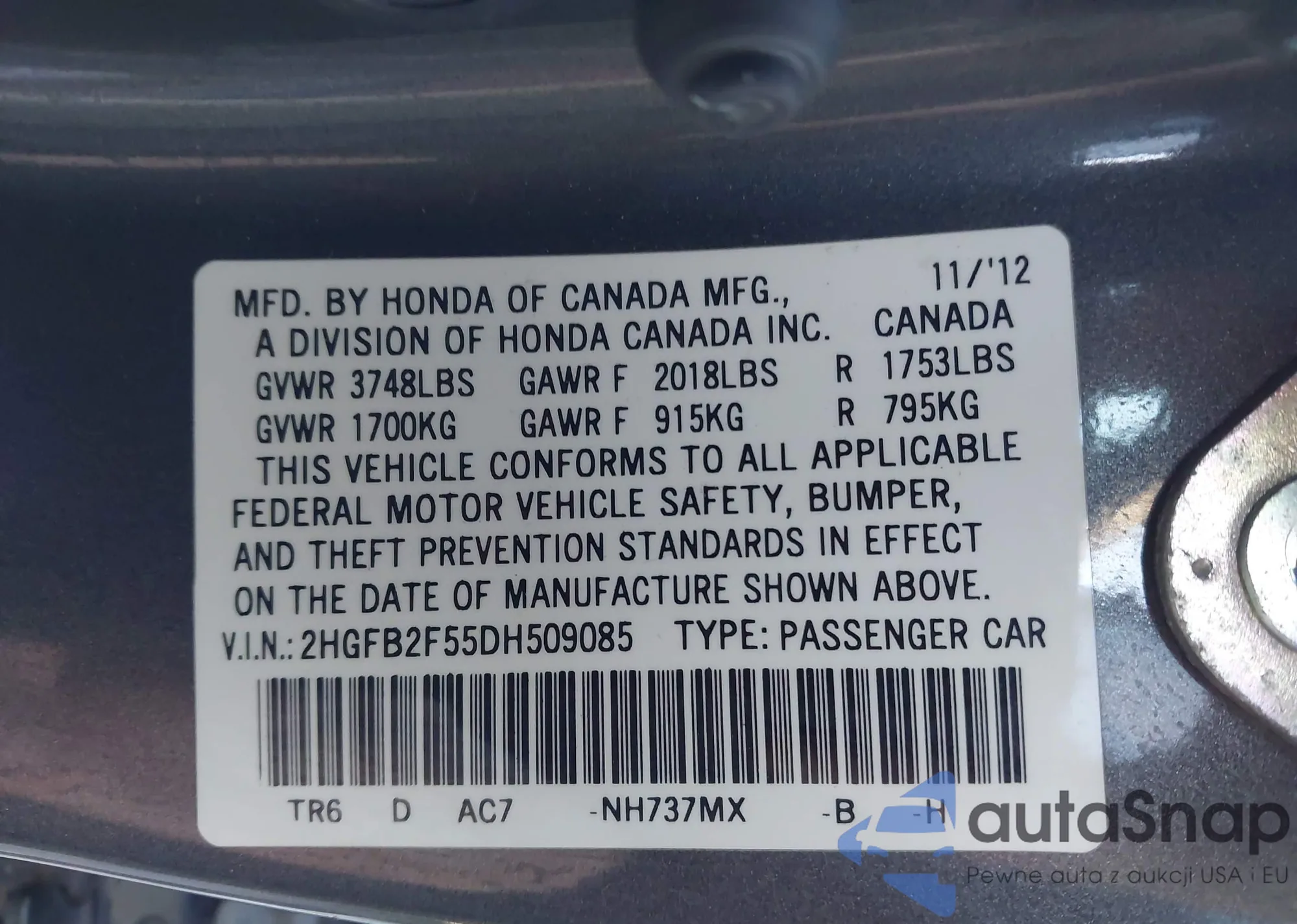 LOT: 43343611 VIN: 2HGFB2F55DH509085