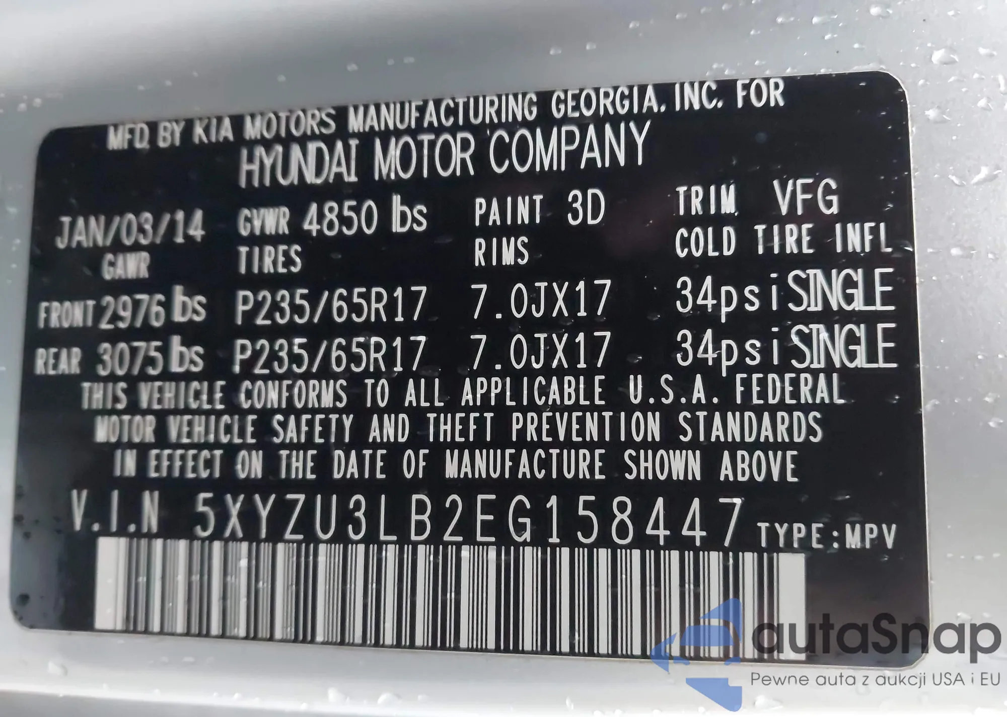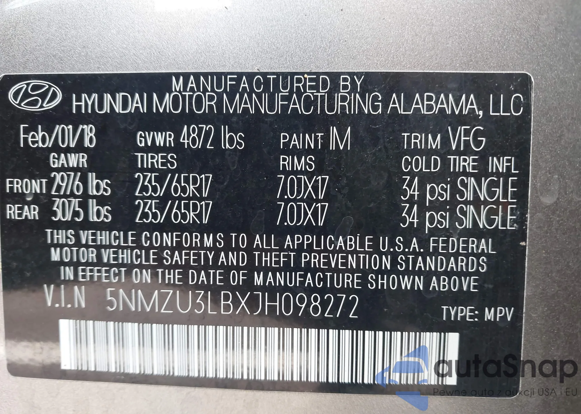 • VIN 5NMZU3LBXJH098272