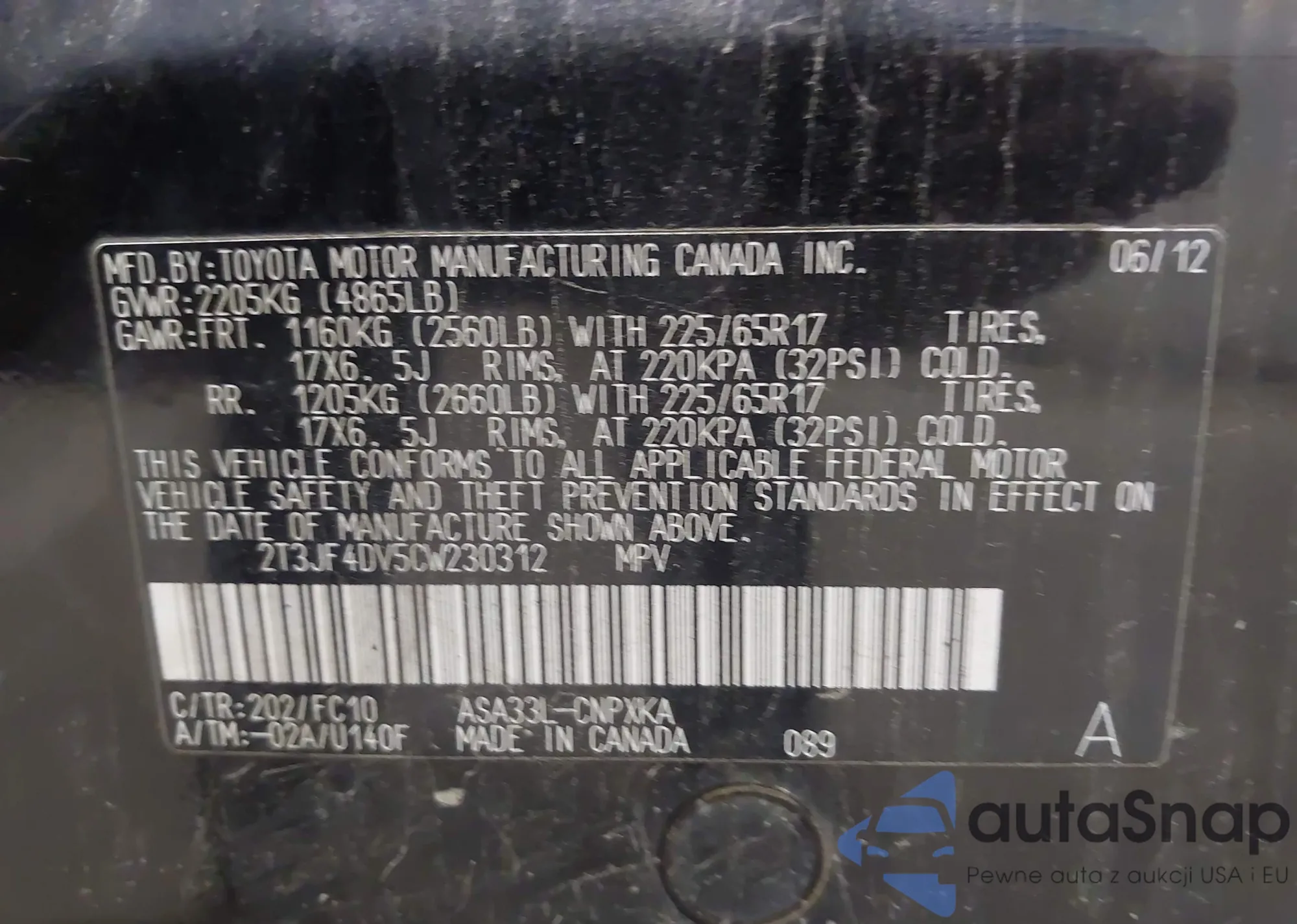 • VIN 2T3JF4DV5CW230312